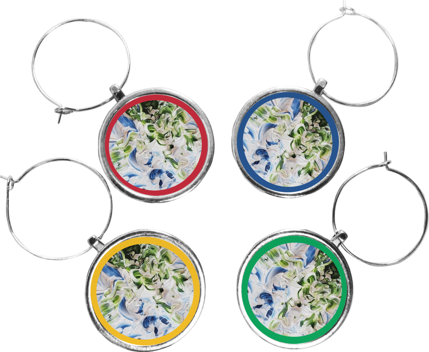 Your wine glass markers are comprised of a circular zinc plate with a 1.25 inch diameter. The zinc plate hangs from a zinc loop, which can be easily secured and removed from the stem of a wine glass. Your customized design is printed onto a 1 inch diameter insert, and then placed into the wine glass charm itself. Though sold in a set of four, you can personalize each charm individually and change the colors of the ring around your design, depending on your needs.