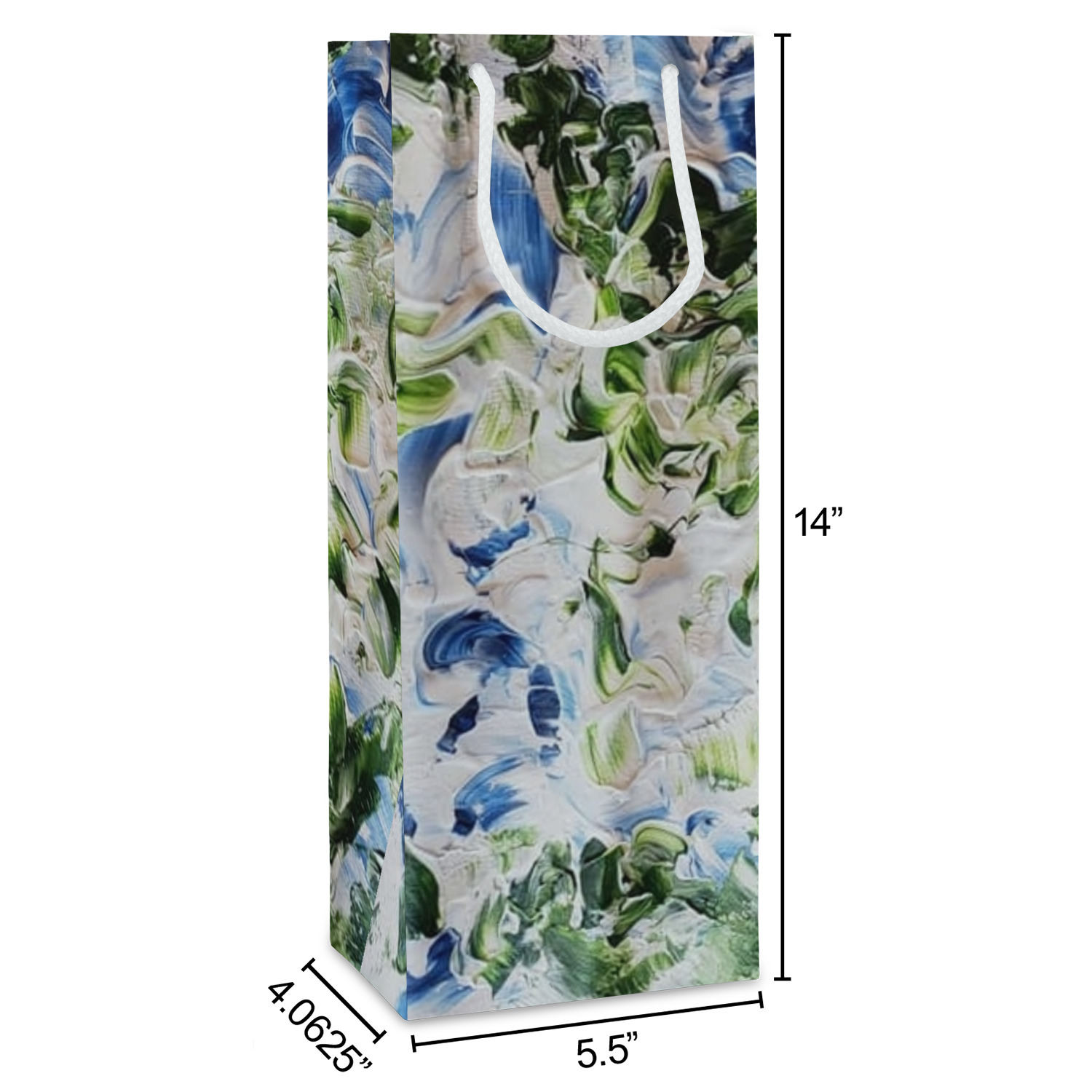 Our wine bags are printed on premium paper. The bags are then cut, scored and folded. The handles and cardstock base it attached. These custom wine bags are printed and made in the USA.