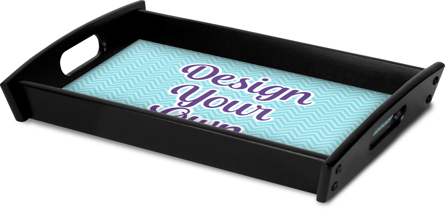 This serving tray with handles features square edges and two rounded sides, creating a very modern look. Each side is fabricated from a beautifully cut, natural wood. The bottom of the interior of the tray displays your customized design in bright, vibrant color. The tray is sold in both a black color and a natural wood look. Each variation of the wood serving tray has two sizes: Small, which is 14" x 10" x 2.25", and Large, which is 19.5" x 13.5" x 2.75".