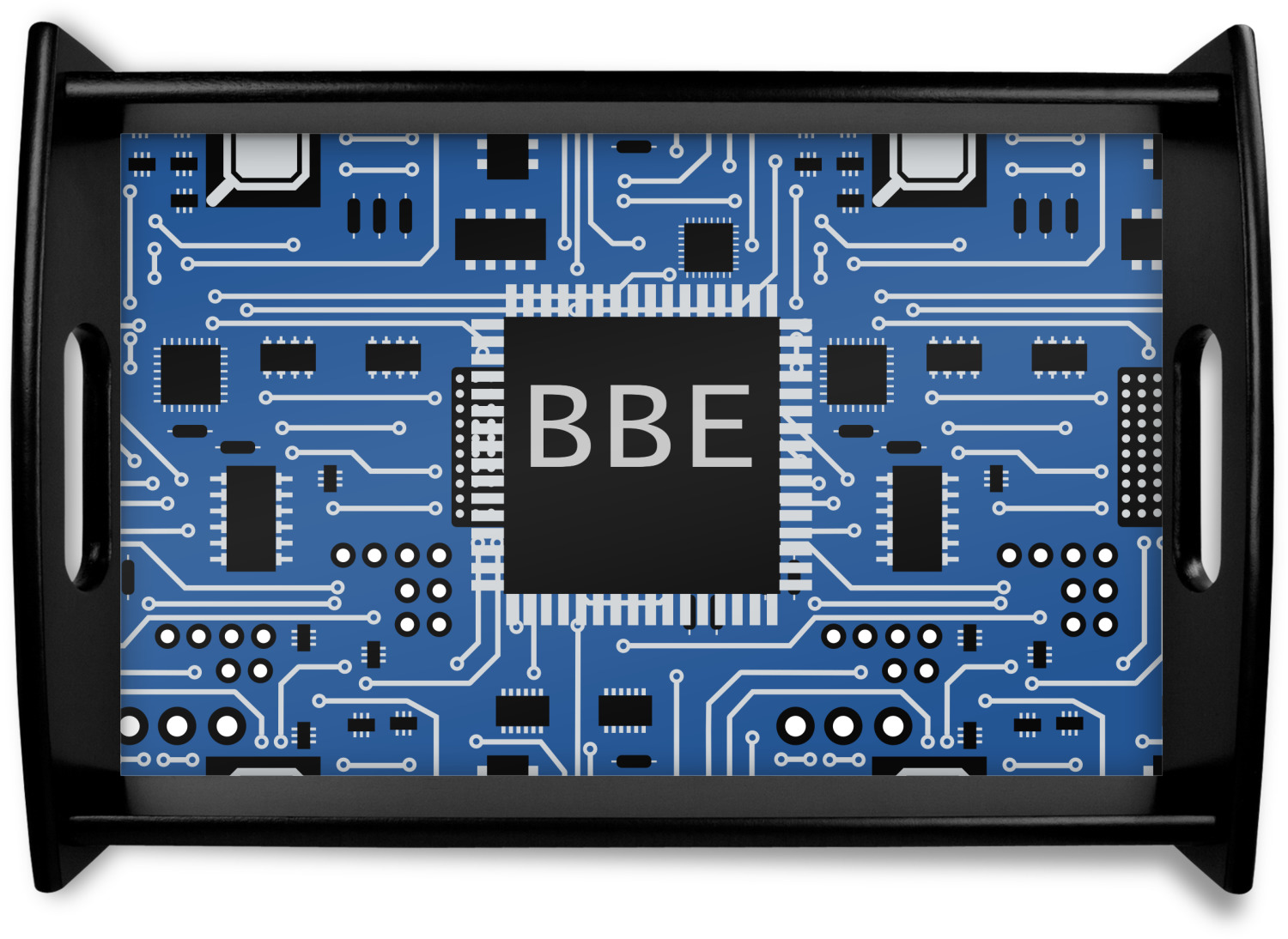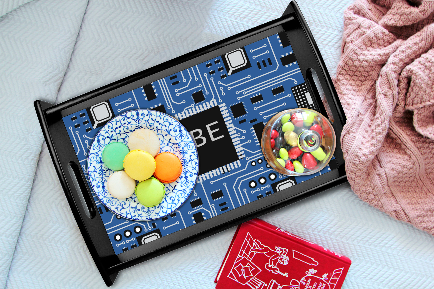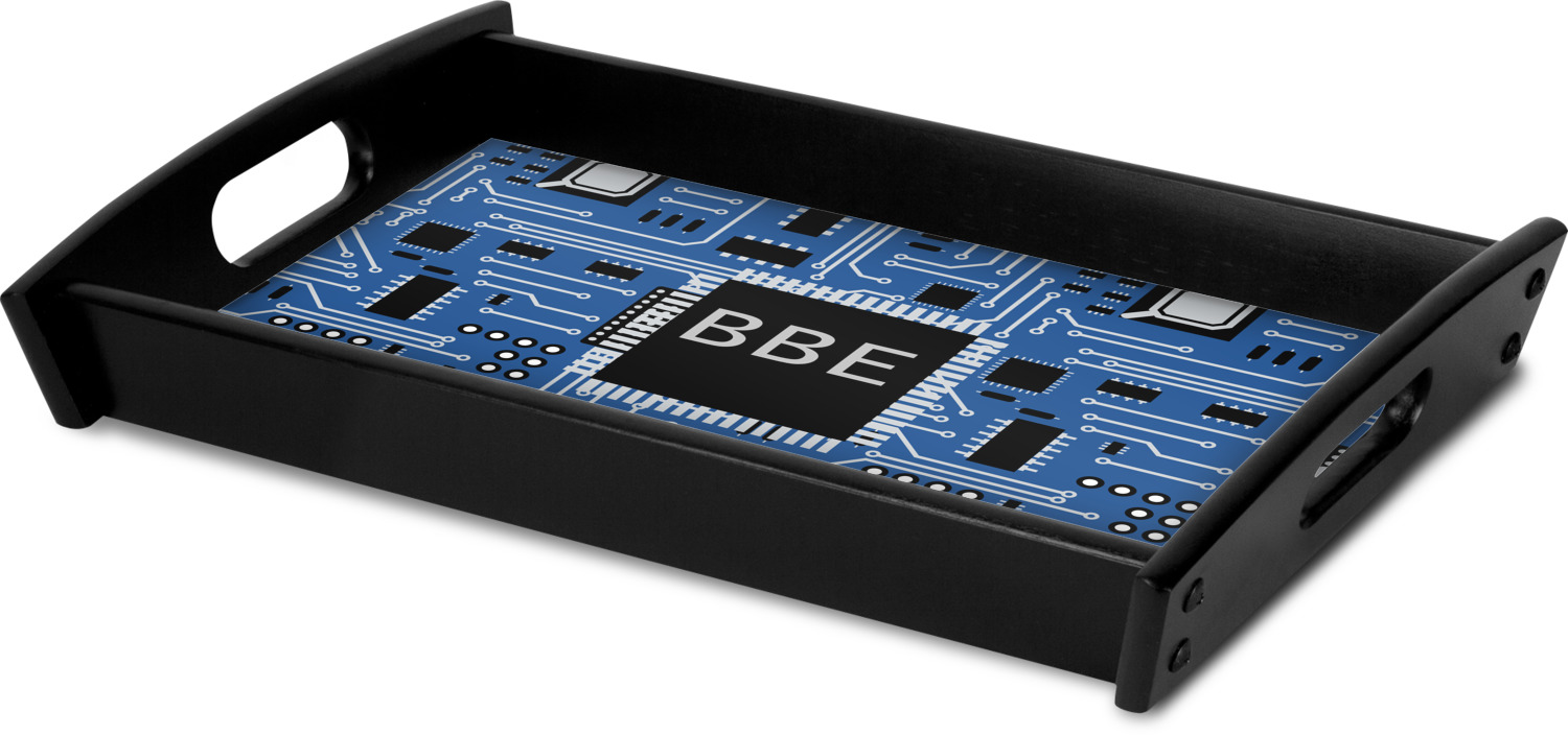 This serving tray with handles features square edges and two rounded sides, creating a very modern look. Each side is fabricated from a beautifully cut, natural wood. The bottom of the interior of the tray displays your customized design in bright, vibrant color. The tray is sold in both a black color and a natural wood look. Each variation of the wood serving tray has two sizes: Small, which is 14" x 10" x 2.25", and Large, which is 19.5" x 13.5" x 2.75".