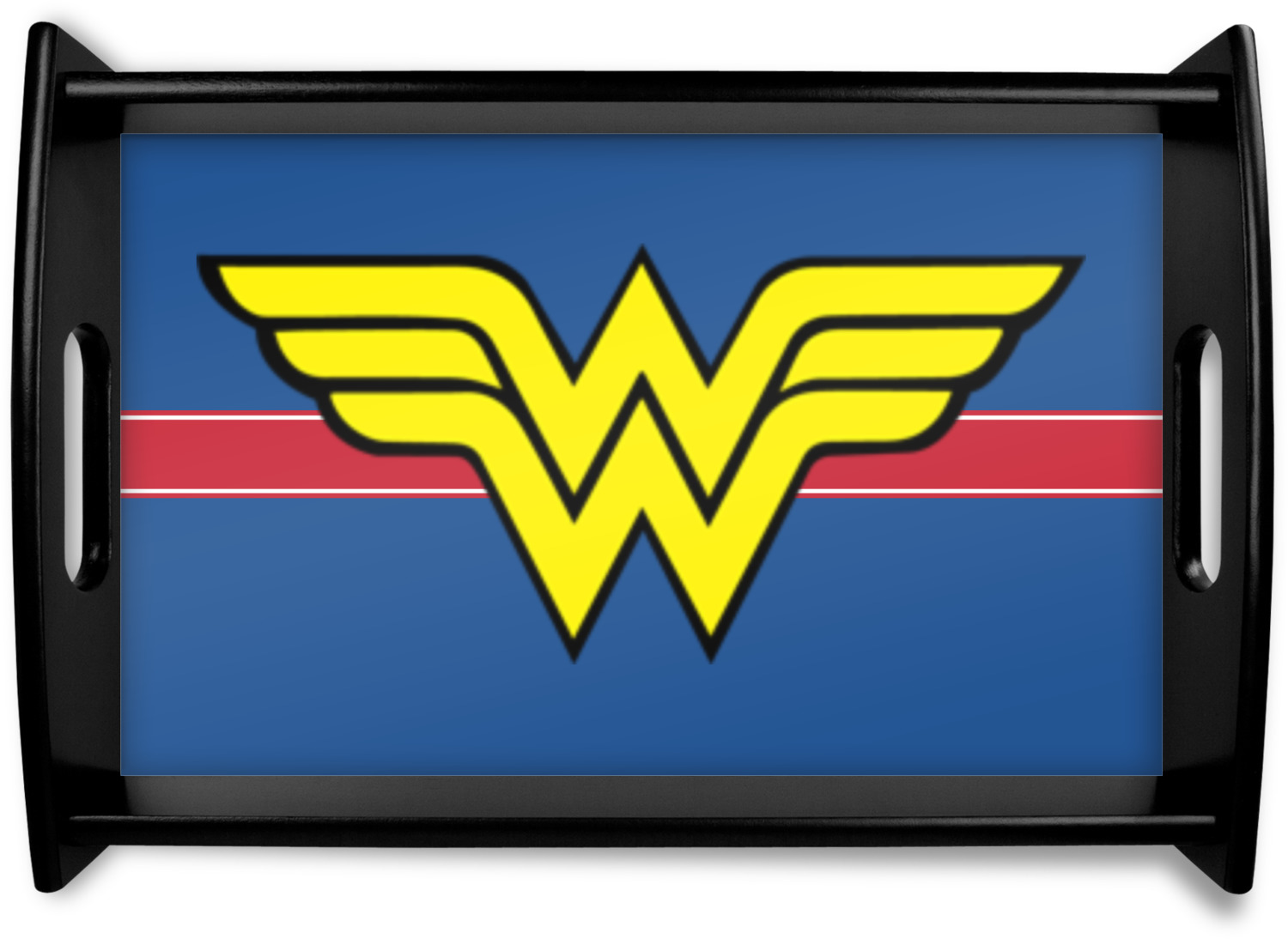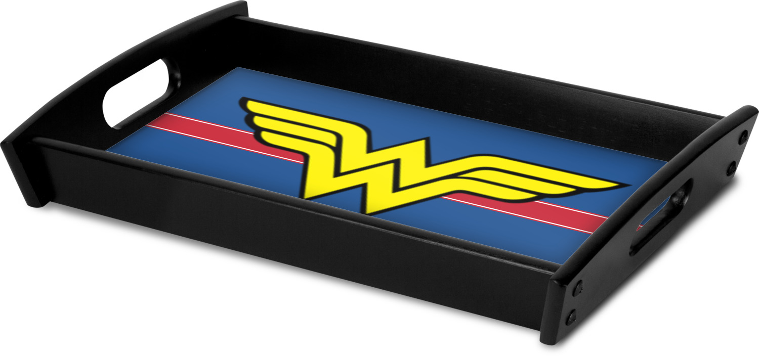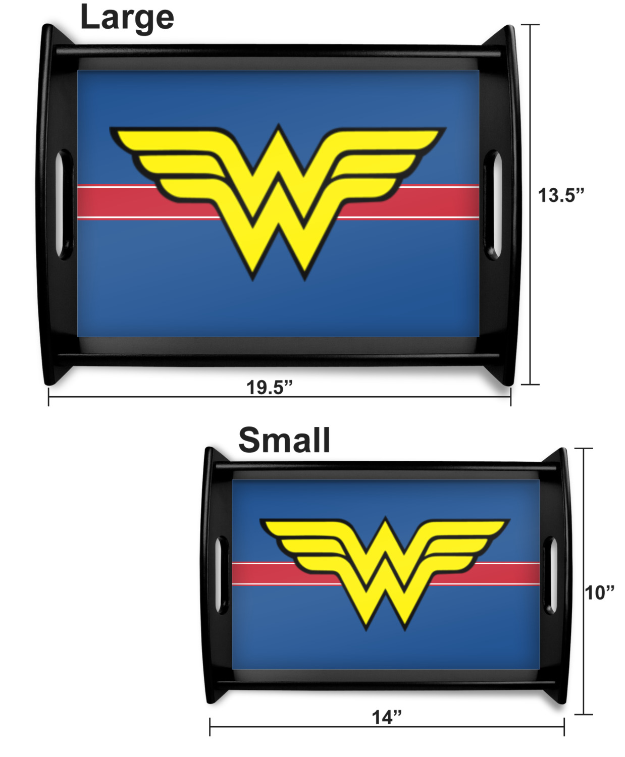 This serving tray with handles features square edges and two rounded sides, creating a very modern look. Each side is fabricated from a beautifully cut, natural wood. The bottom of the interior of the tray displays your customized design in bright, vibrant color. The tray is sold in both a black color and a natural wood look. Each variation of the wood serving tray has two sizes: Small, which is 14" x 10" x 2.25", and Large, which is 19.5" x 13.5" x 2.75".