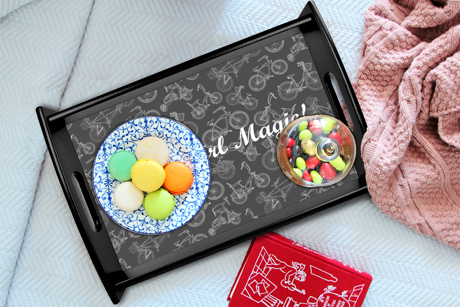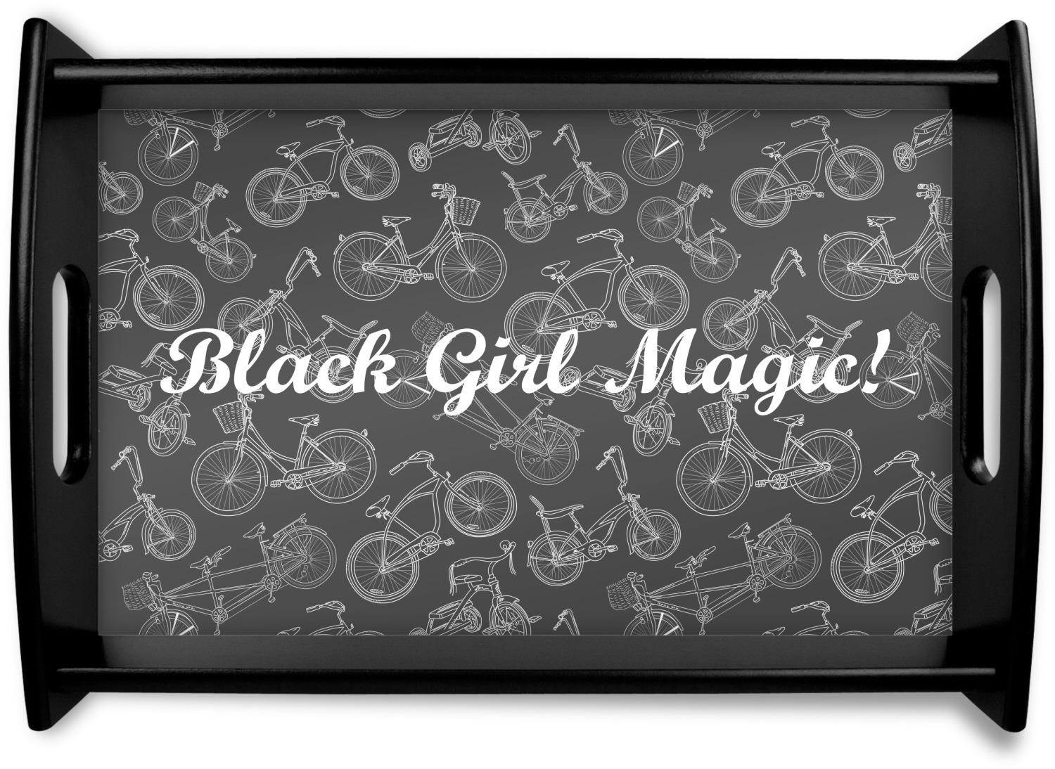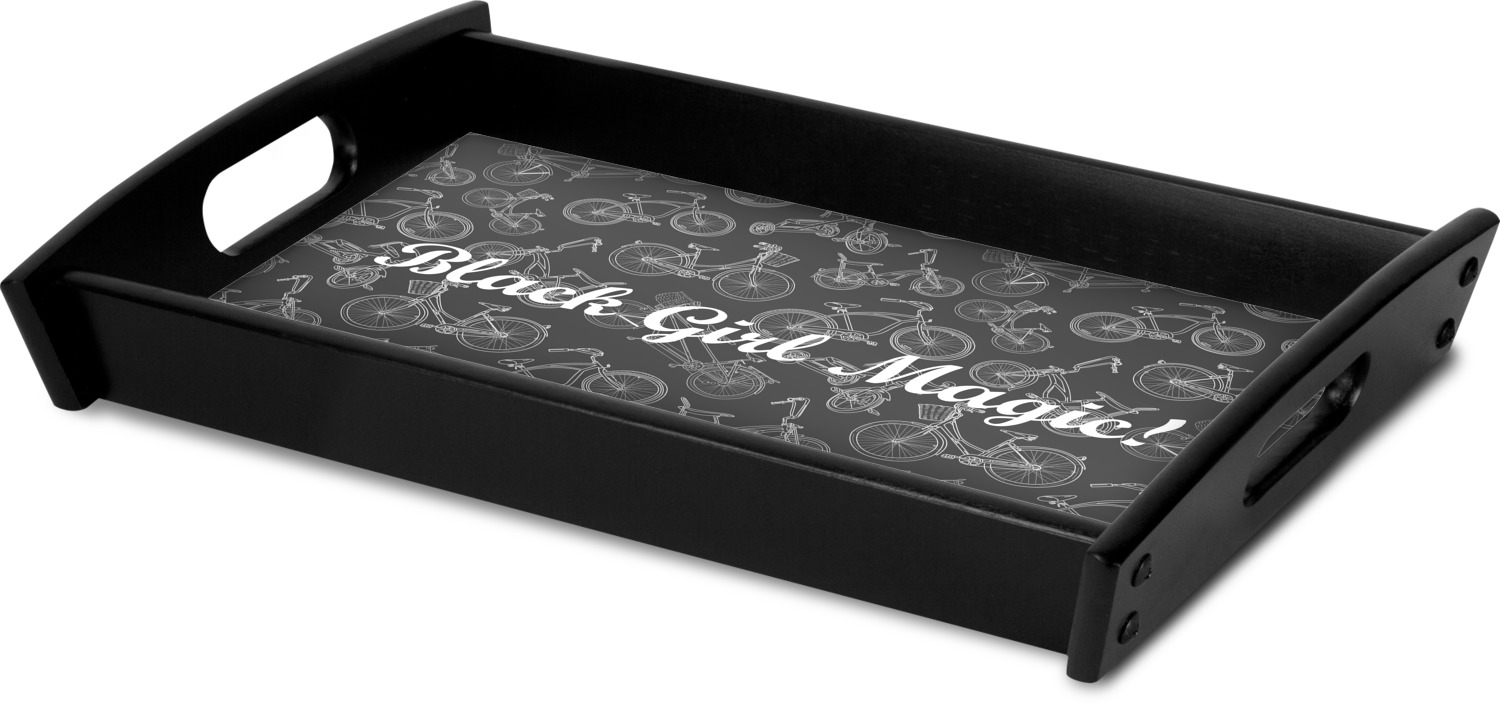 This serving tray with handles features square edges and two rounded sides, creating a very modern look. Each side is fabricated from a beautifully cut, natural wood. The bottom of the interior of the tray displays your customized design in bright, vibrant color. The tray is sold in both a black color and a natural wood look. Each variation of the wood serving tray has two sizes: Small, which is 14" x 10" x 2.25", and Large, which is 19.5" x 13.5" x 2.75".