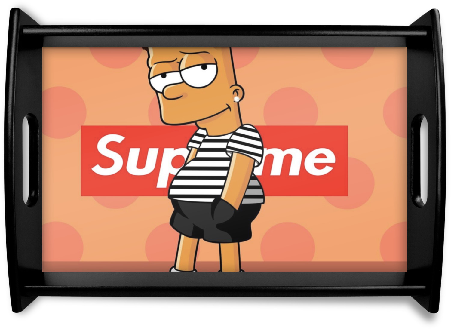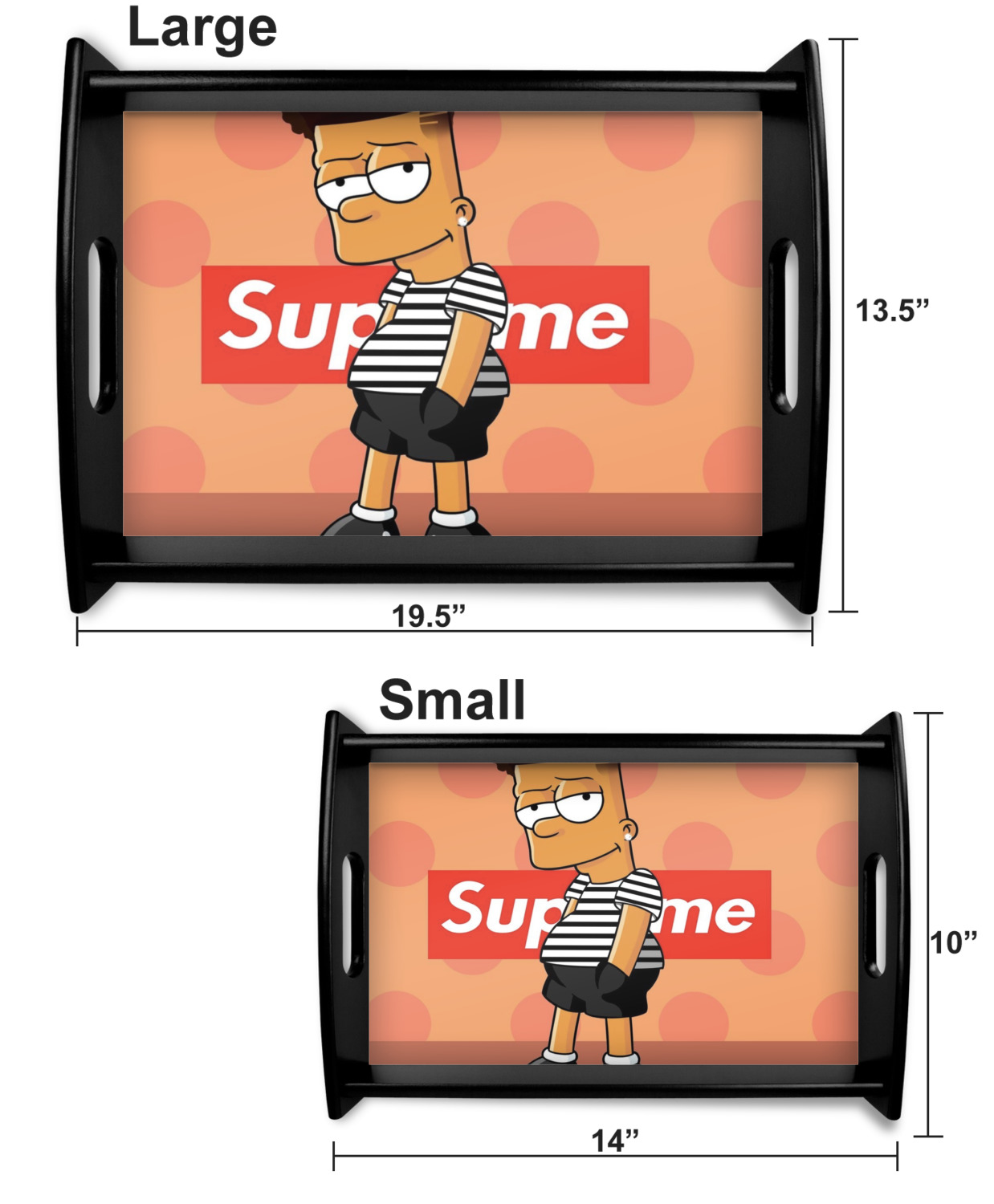 This serving tray with handles features square edges and two rounded sides, creating a very modern look. Each side is fabricated from a beautifully cut, natural wood. The bottom of the interior of the tray displays your customized design in bright, vibrant color. The tray is sold in both a black color and a natural wood look. Each variation of the wood serving tray has two sizes: Small, which is 14" x 10" x 2.25", and Large, which is 19.5" x 13.5" x 2.75".