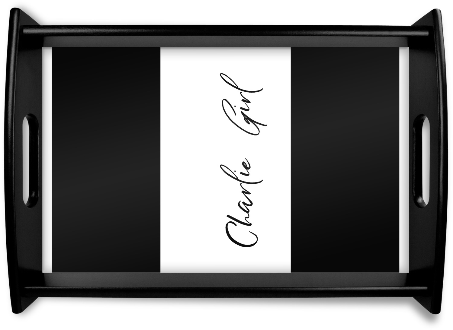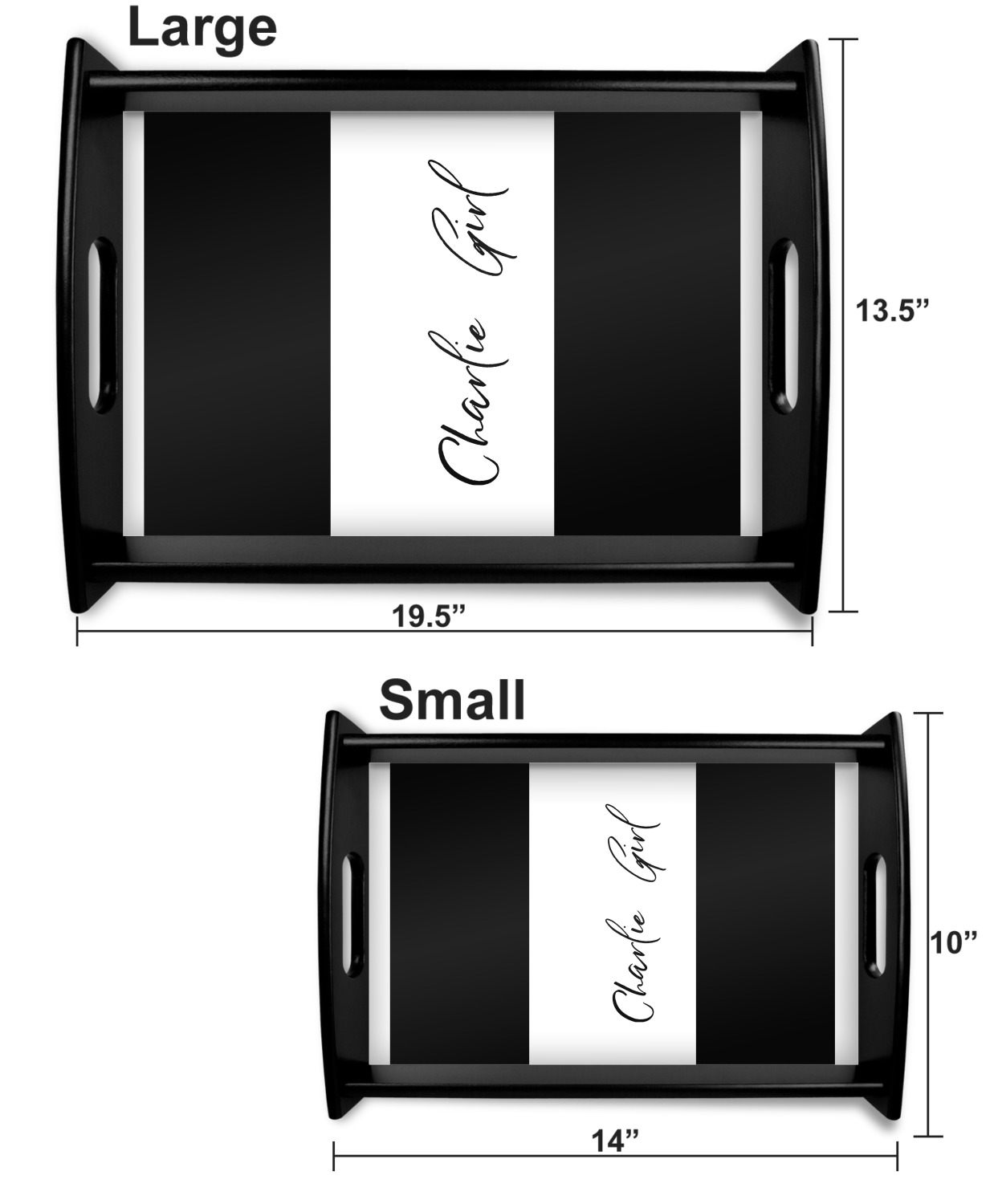 This serving tray with handles features square edges and two rounded sides, creating a very modern look. Each side is fabricated from a beautifully cut, natural wood. The bottom of the interior of the tray displays your customized design in bright, vibrant color. The tray is sold in both a black color and a natural wood look. Each variation of the wood serving tray has two sizes: Small, which is 14" x 10" x 2.25", and Large, which is 19.5" x 13.5" x 2.75".