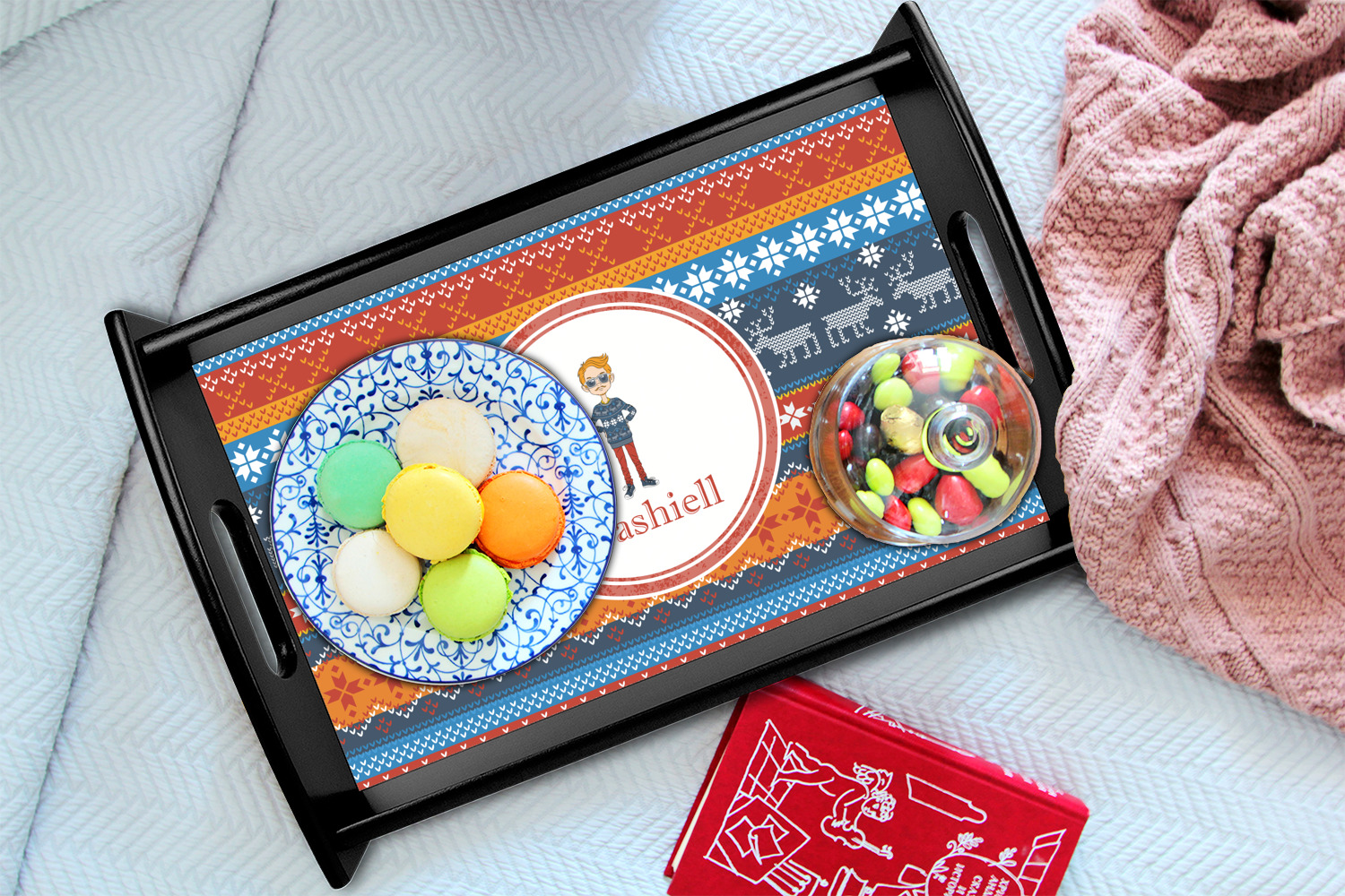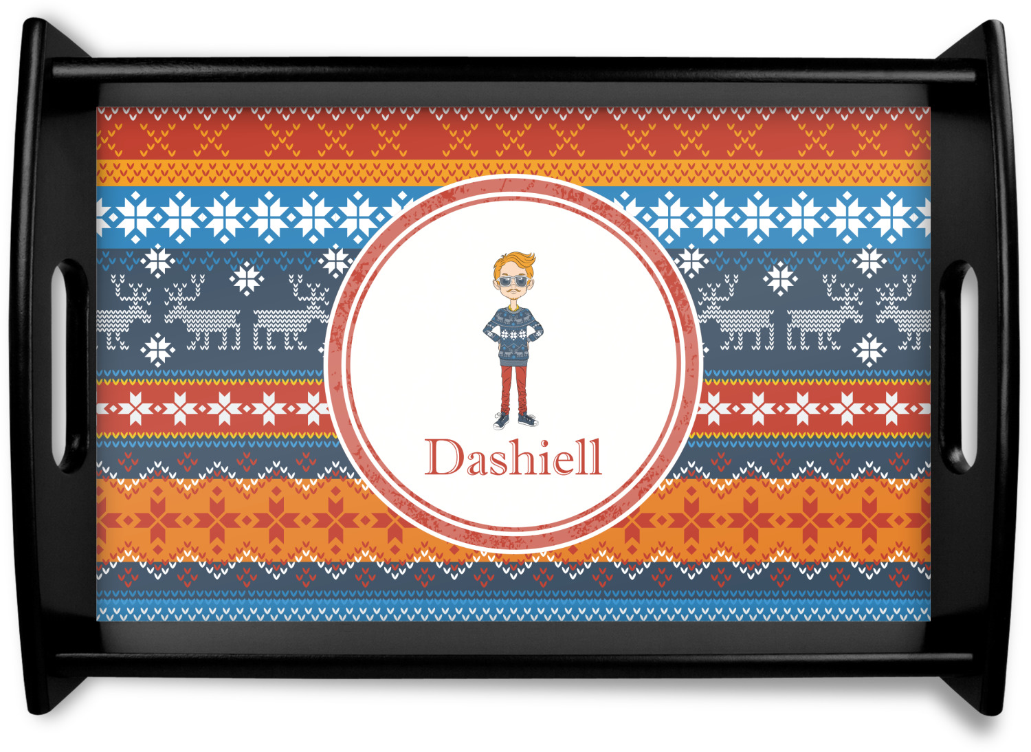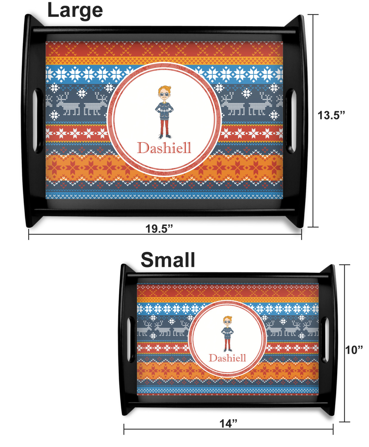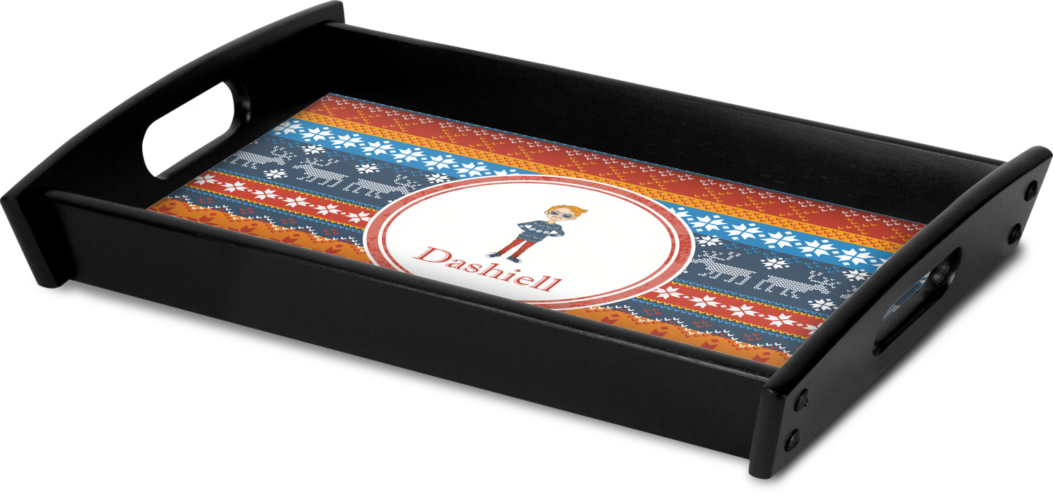 This serving tray with handles features square edges and two rounded sides, creating a very modern look. Each side is fabricated from a beautifully cut, natural wood. The bottom of the interior of the tray displays your customized design in bright, vibrant color. The tray is sold in both a black color and a natural wood look. Each variation of the wood serving tray has two sizes: Small, which is 14" x 10" x 2.25", and Large, which is 19.5" x 13.5" x 2.75".