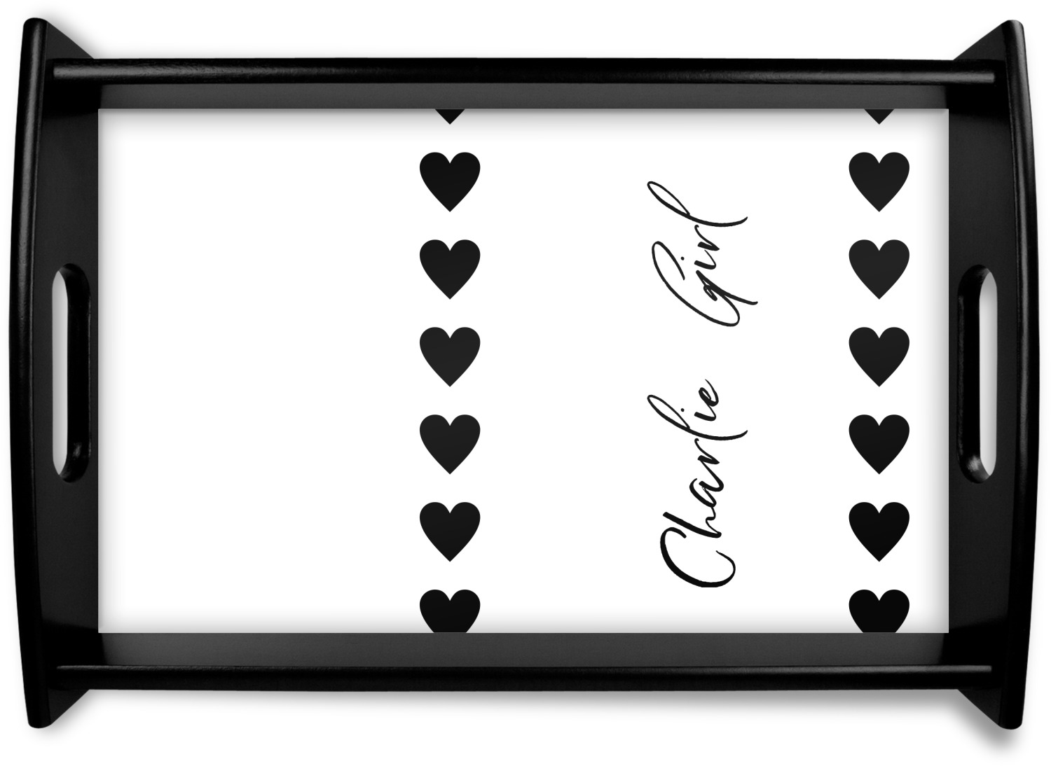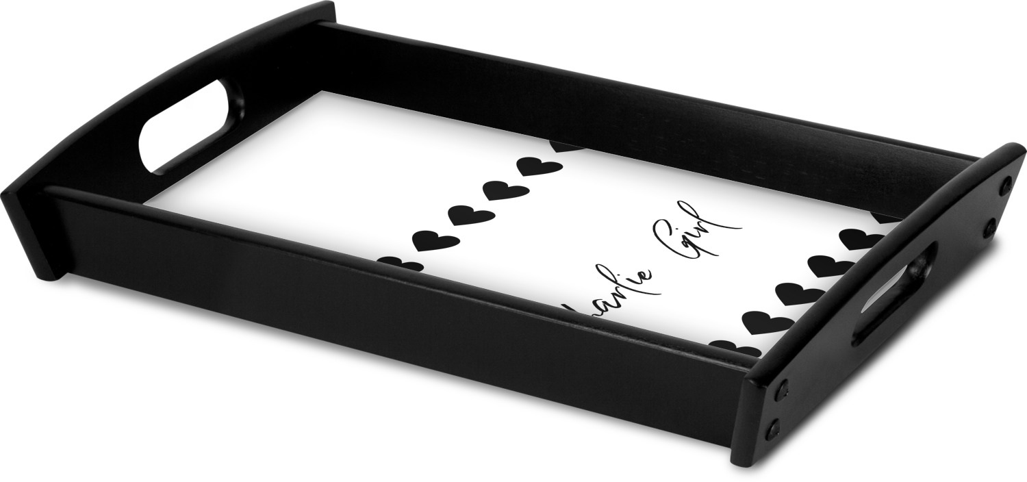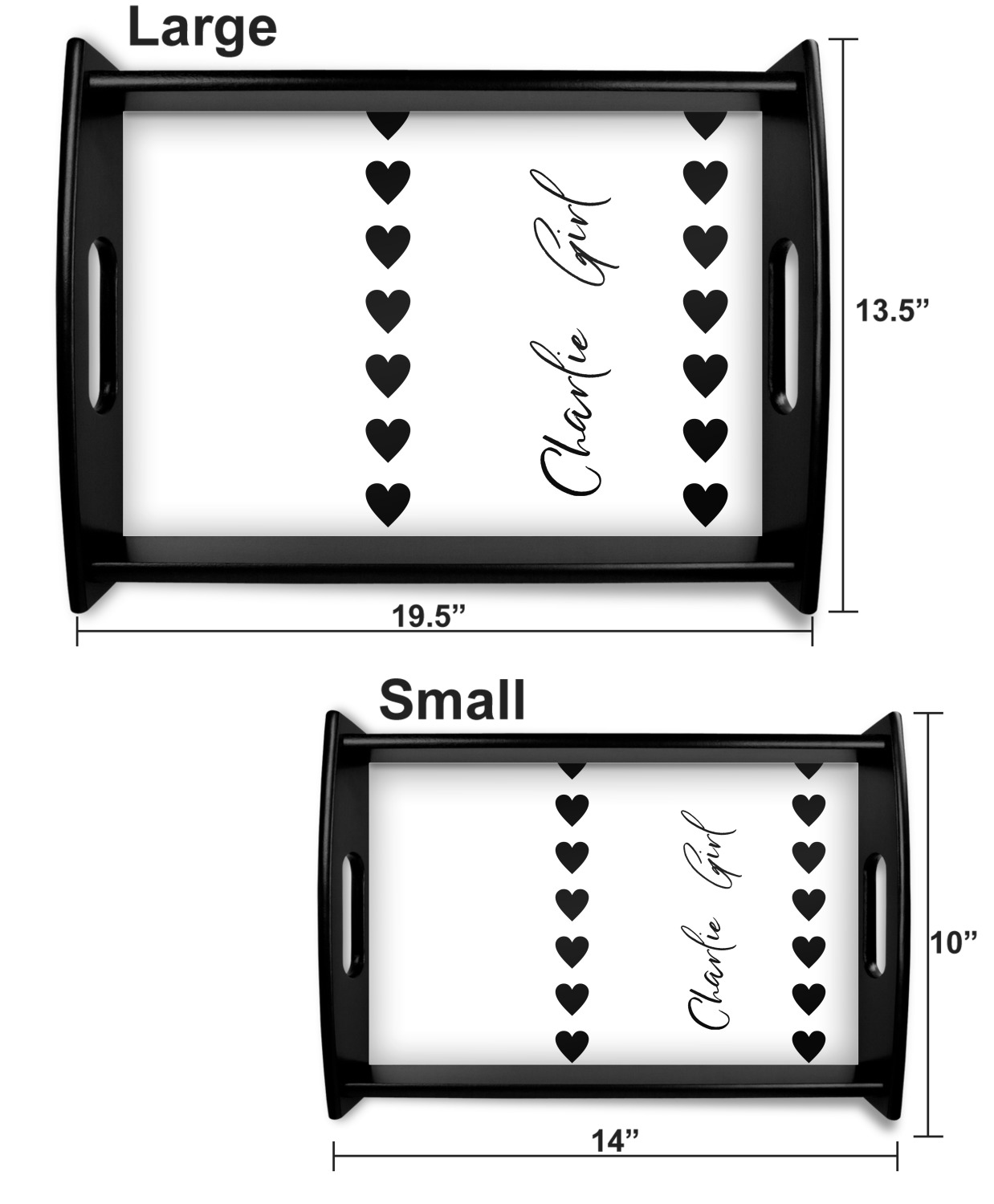This serving tray with handles features square edges and two rounded sides, creating a very modern look. Each side is fabricated from a beautifully cut, natural wood. The bottom of the interior of the tray displays your customized design in bright, vibrant color. The tray is sold in both a black color and a natural wood look. Each variation of the wood serving tray has two sizes: Small, which is 14" x 10" x 2.25", and Large, which is 19.5" x 13.5" x 2.75".