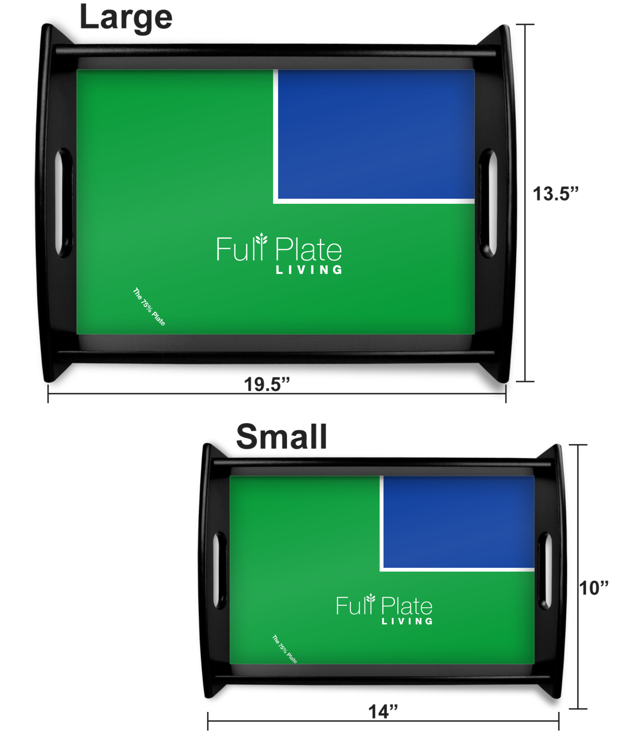 This serving tray with handles features square edges and two rounded sides, creating a very modern look. Each side is fabricated from a beautifully cut, natural wood. The bottom of the interior of the tray displays your customized design in bright, vibrant color. The tray is sold in both a black color and a natural wood look. Each variation of the wood serving tray has two sizes: Small, which is 14" x 10" x 2.25", and Large, which is 19.5" x 13.5" x 2.75".