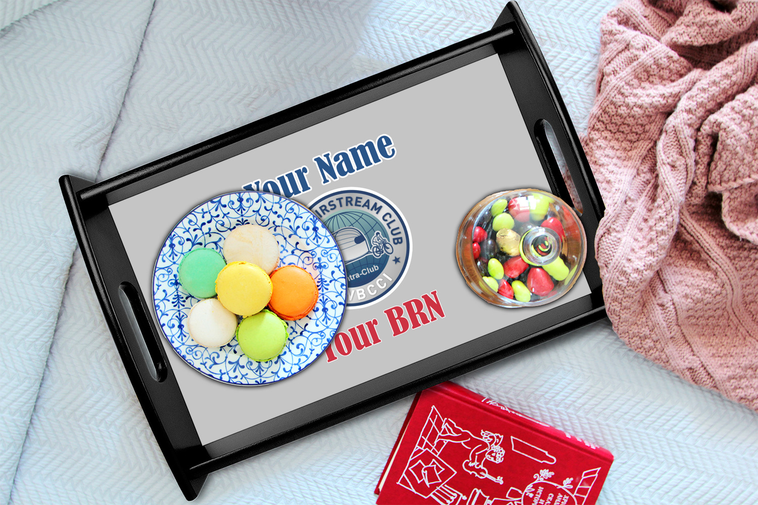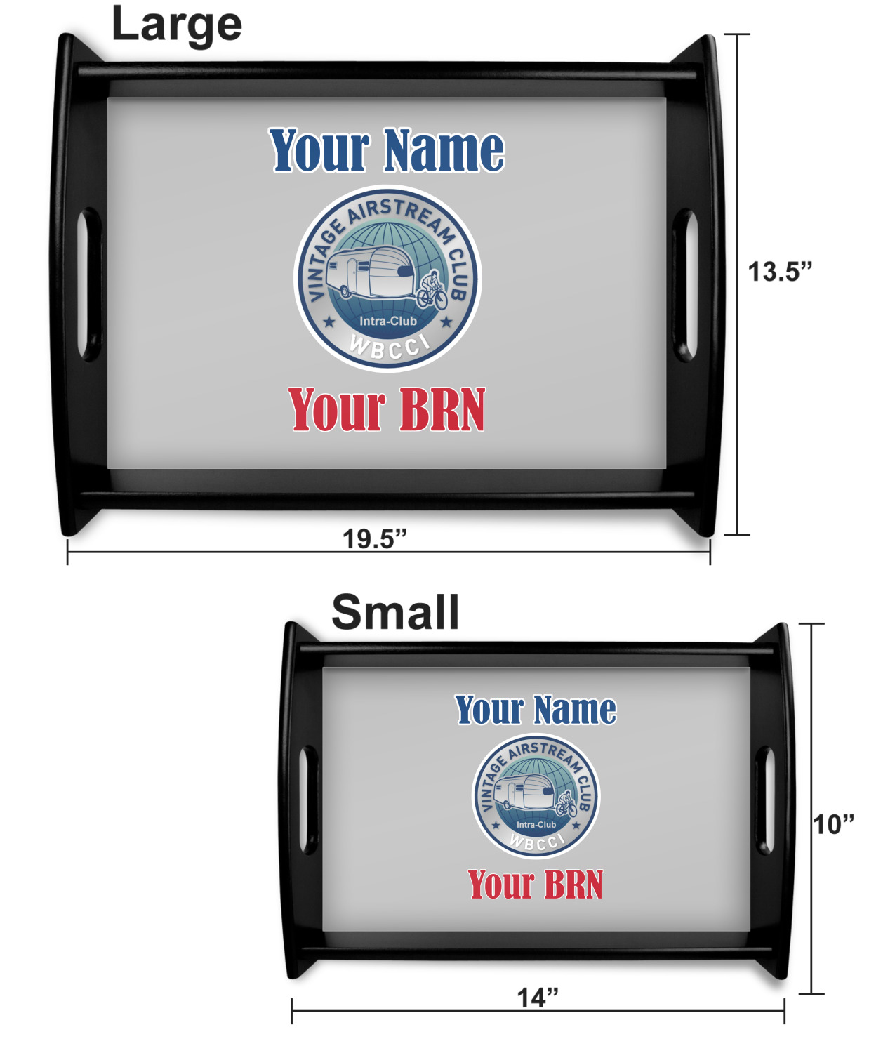 This serving tray with handles features square edges and two rounded sides, creating a very modern look. Each side is fabricated from a beautifully cut, natural wood. The bottom of the interior of the tray displays your customized design in bright, vibrant color. The tray is sold in both a black color and a natural wood look. Each variation of the wood serving tray has two sizes: Small, which is 14" x 10" x 2.25", and Large, which is 19.5" x 13.5" x 2.75".