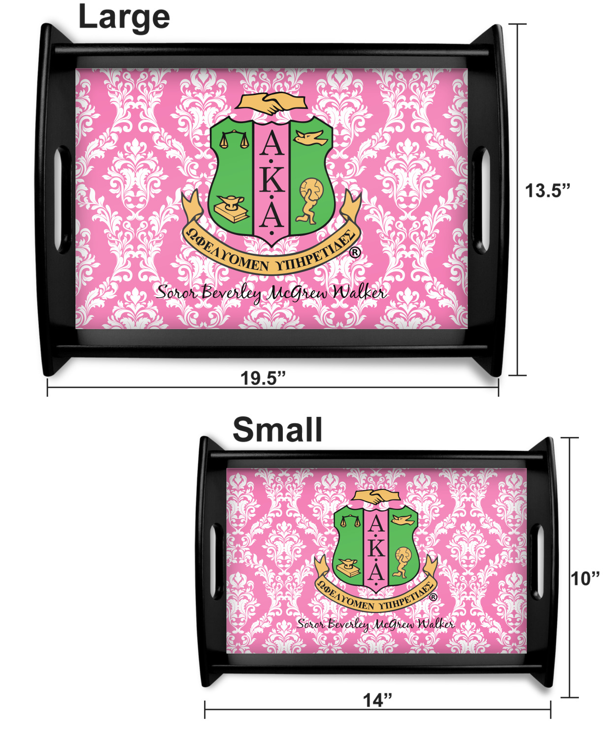 This serving tray with handles features square edges and two rounded sides, creating a very modern look. Each side is fabricated from a beautifully cut, natural wood. The bottom of the interior of the tray displays your customized design in bright, vibrant color. The tray is sold in both a black color and a natural wood look. Each variation of the wood serving tray has two sizes: Small, which is 14" x 10" x 2.25", and Large, which is 19.5" x 13.5" x 2.75".