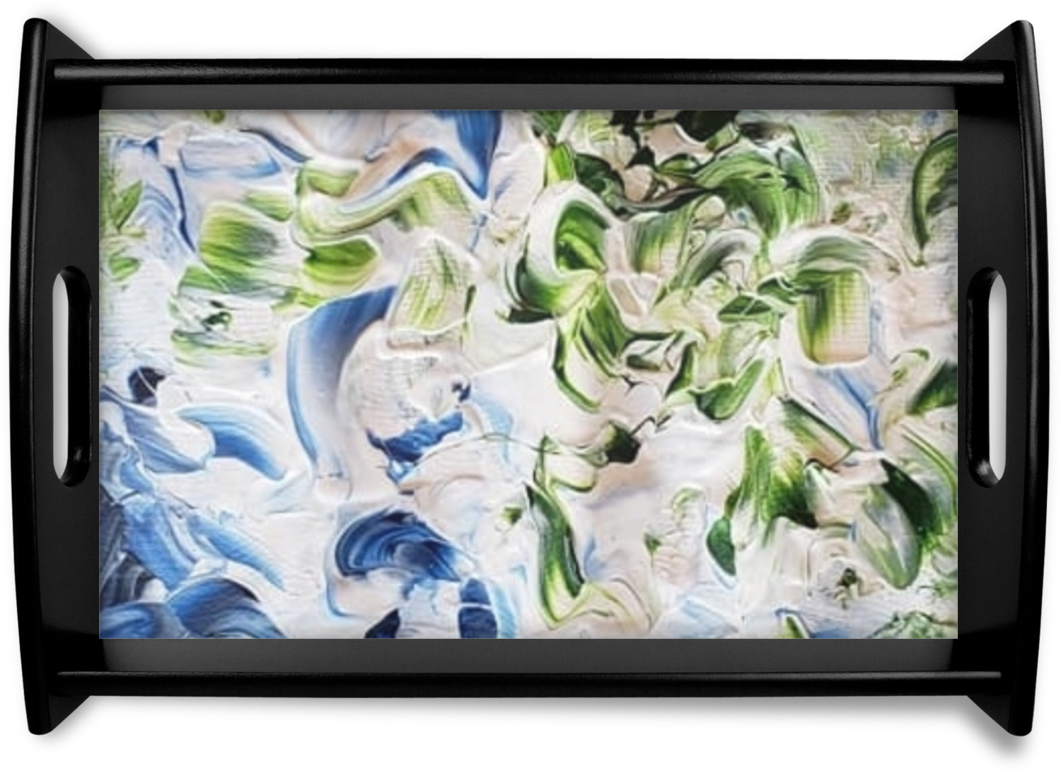 This serving tray with handles features square edges and two rounded sides, creating a very modern look. Each side is fabricated from a beautifully cut, natural wood. The bottom of the interior of the tray displays your customized design in bright, vibrant color. The tray is sold in both a black color and a natural wood look. Each variation of the wood serving tray has two sizes: Small, which is 14" x 10" x 2.25", and Large, which is 19.5" x 13.5" x 2.75".