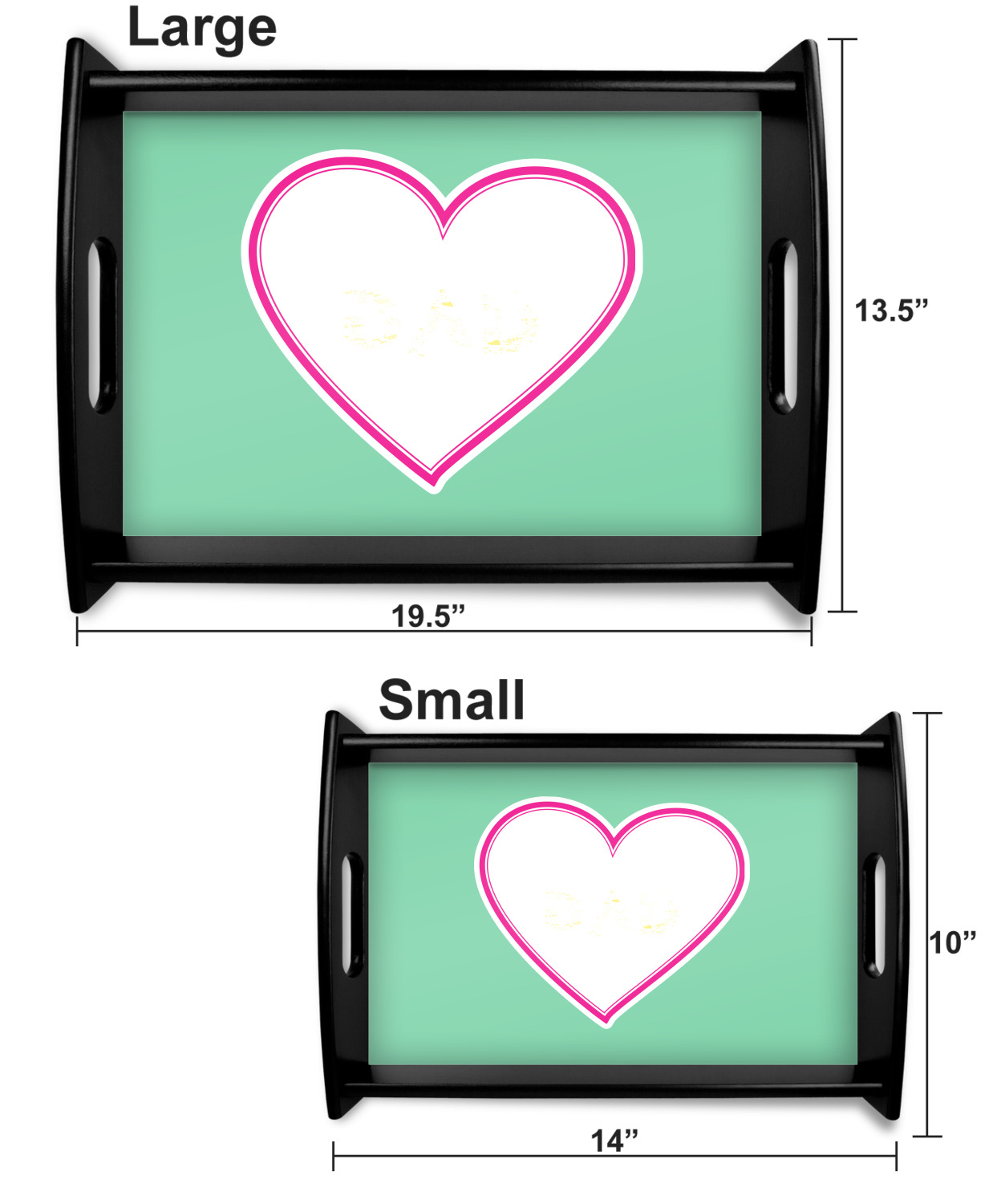 This serving tray with handles features square edges and two rounded sides, creating a very modern look. Each side is fabricated from a beautifully cut, natural wood. The bottom of the interior of the tray displays your customized design in bright, vibrant color. The tray is sold in both a black color and a natural wood look. Each variation of the wood serving tray has two sizes: Small, which is 14" x 10" x 2.25", and Large, which is 19.5" x 13.5" x 2.75".