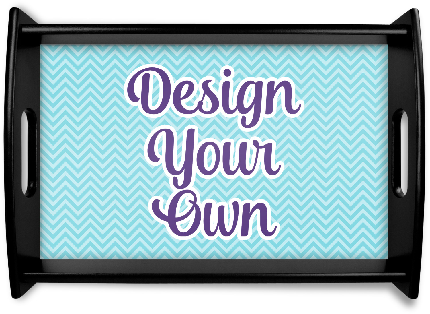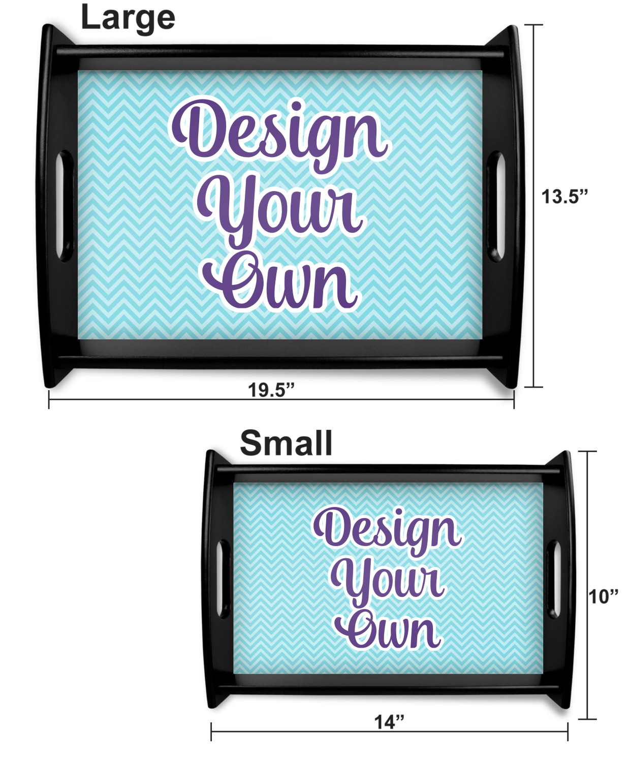 This serving tray with handles features square edges and two rounded sides, creating a very modern look. Each side is fabricated from a beautifully cut, natural wood. The bottom of the interior of the tray displays your customized design in bright, vibrant color. The tray is sold in both a black color and a natural wood look. Each variation of the wood serving tray has two sizes: Small, which is 14" x 10" x 2.25", and Large, which is 19.5" x 13.5" x 2.75".