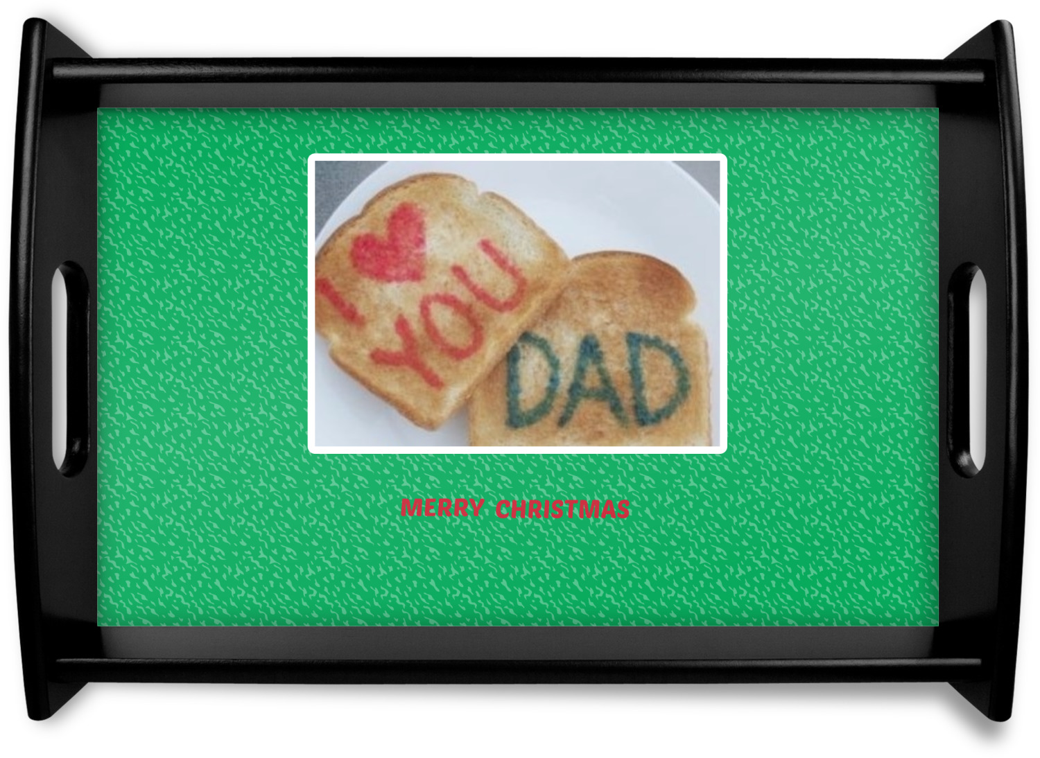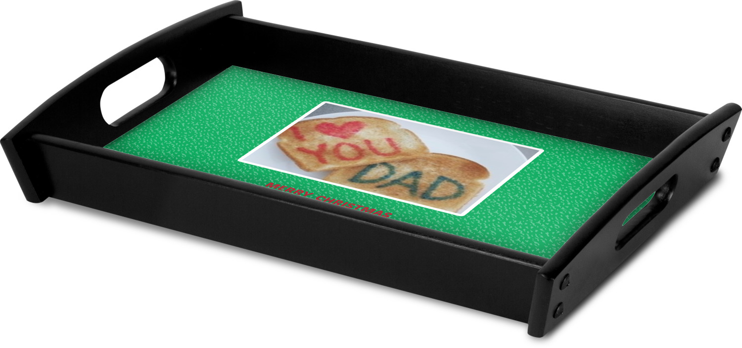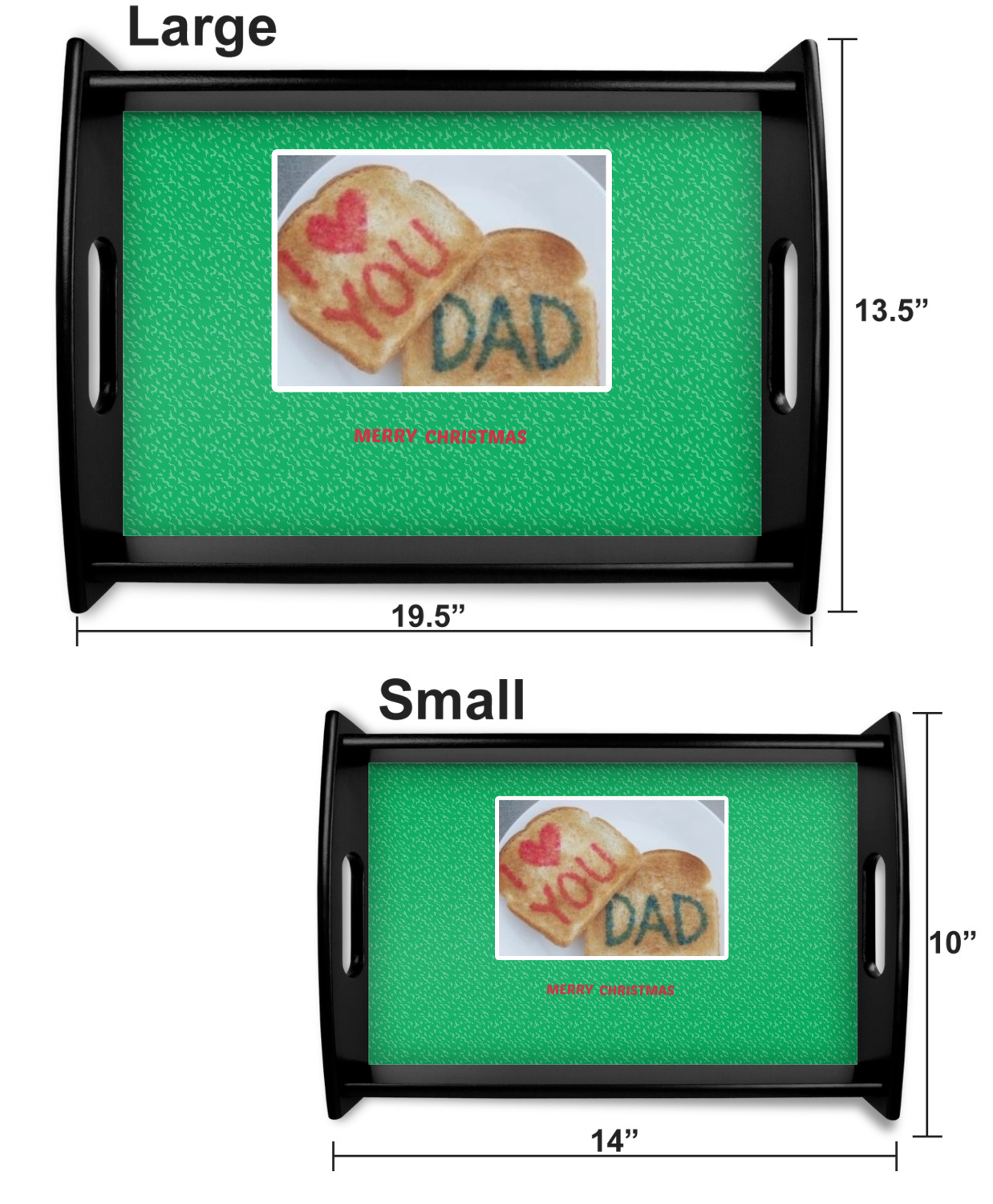 This serving tray with handles features square edges and two rounded sides, creating a very modern look. Each side is fabricated from a beautifully cut, natural wood. The bottom of the interior of the tray displays your customized design in bright, vibrant color. The tray is sold in both a black color and a natural wood look. Each variation of the wood serving tray has two sizes: Small, which is 14" x 10" x 2.25", and Large, which is 19.5" x 13.5" x 2.75".