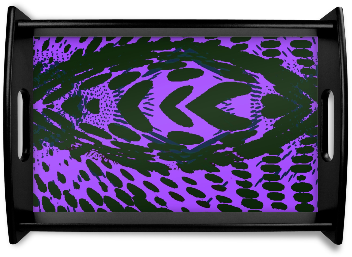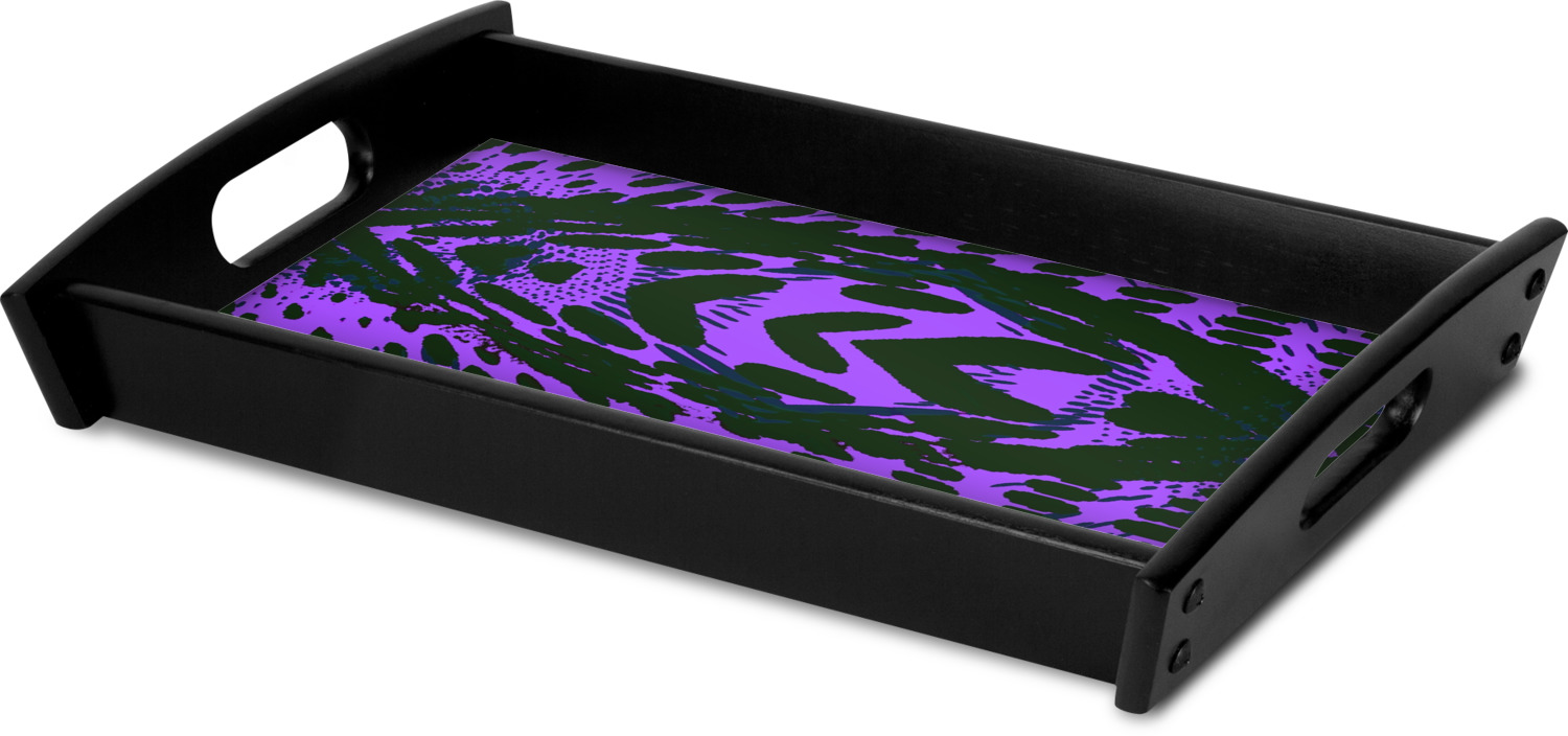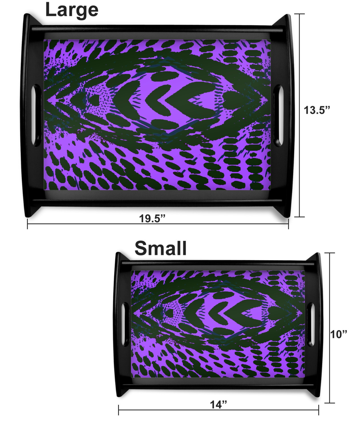 This serving tray with handles features square edges and two rounded sides, creating a very modern look. Each side is fabricated from a beautifully cut, natural wood. The bottom of the interior of the tray displays your customized design in bright, vibrant color. The tray is sold in both a black color and a natural wood look. Each variation of the wood serving tray has two sizes: Small, which is 14" x 10" x 2.25", and Large, which is 19.5" x 13.5" x 2.75".