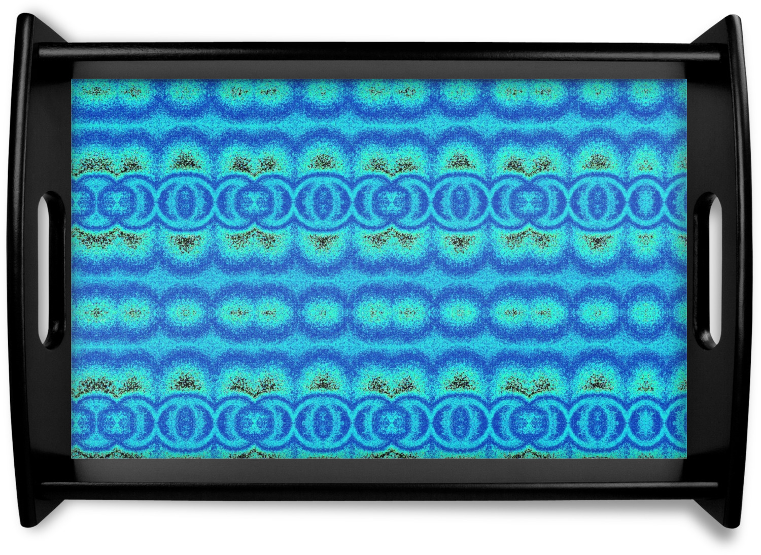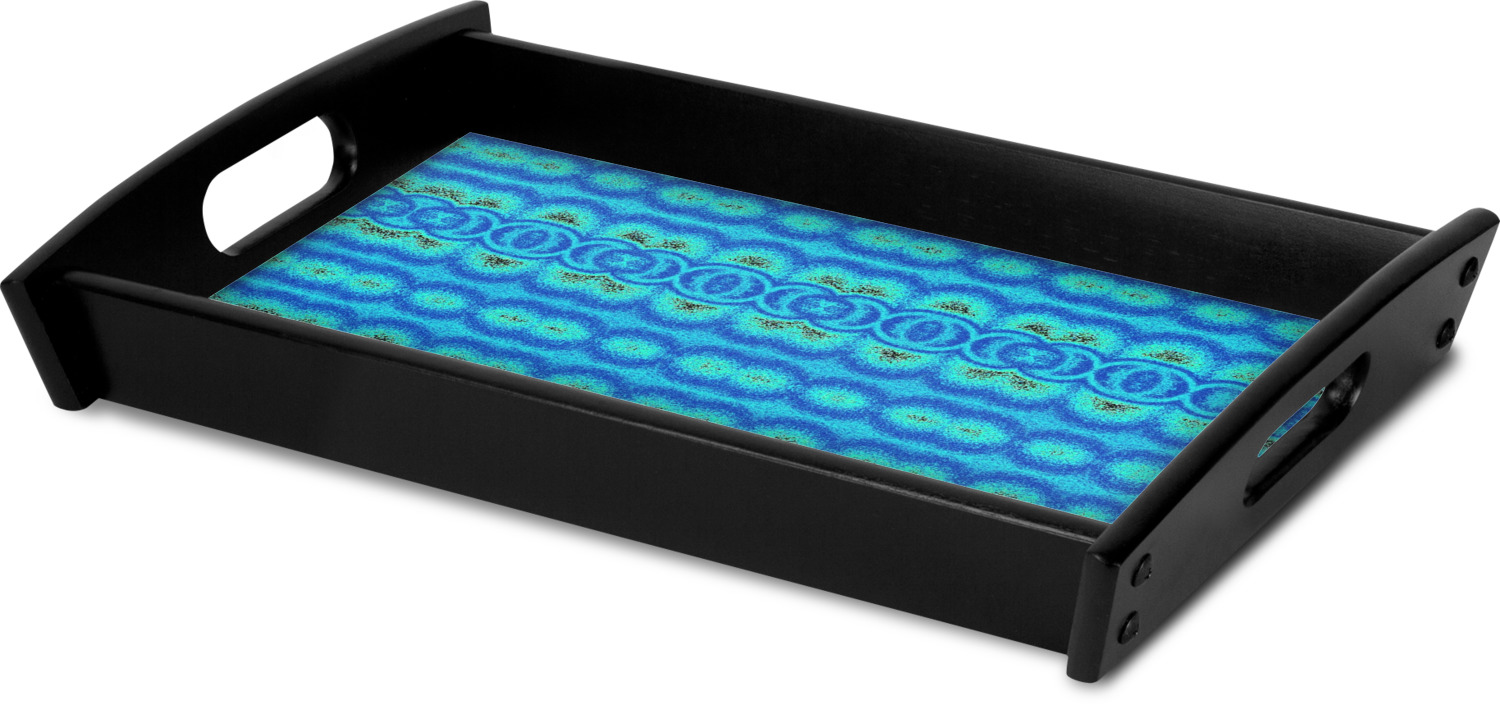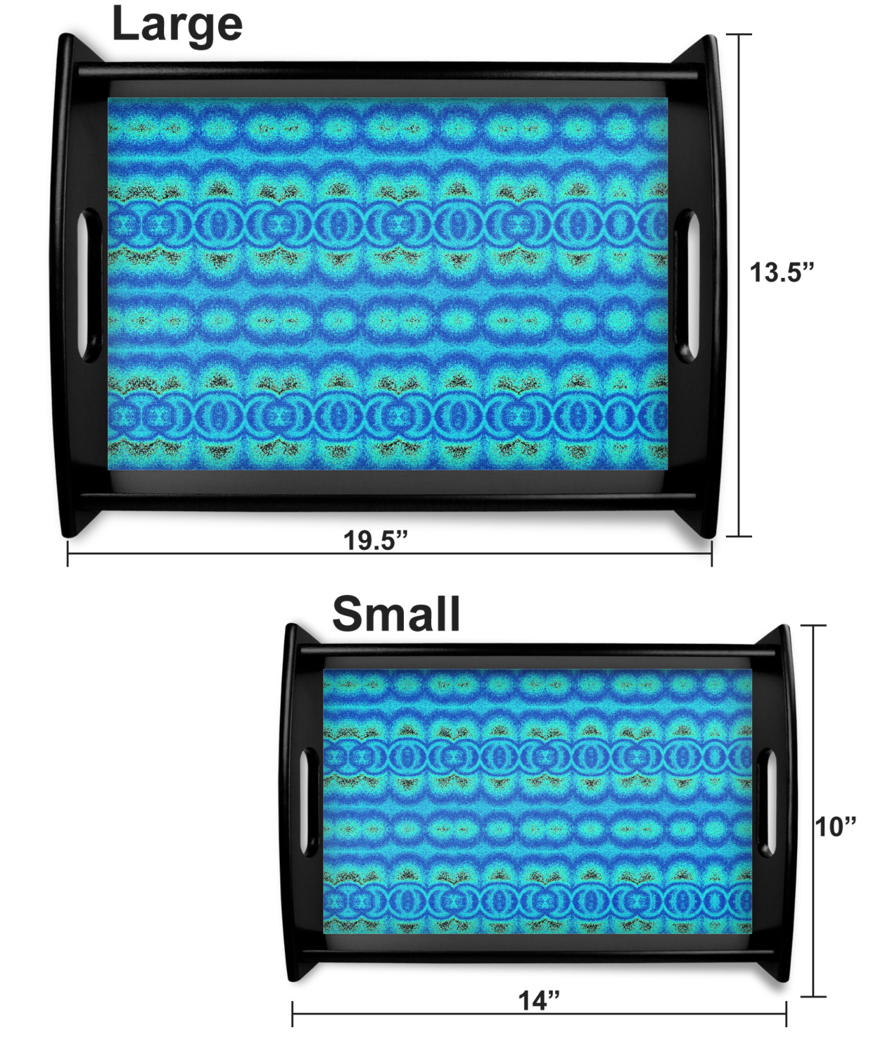 This serving tray with handles features square edges and two rounded sides, creating a very modern look. Each side is fabricated from a beautifully cut, natural wood. The bottom of the interior of the tray displays your customized design in bright, vibrant color. The tray is sold in both a black color and a natural wood look. Each variation of the wood serving tray has two sizes: Small, which is 14" x 10" x 2.25", and Large, which is 19.5" x 13.5" x 2.75".