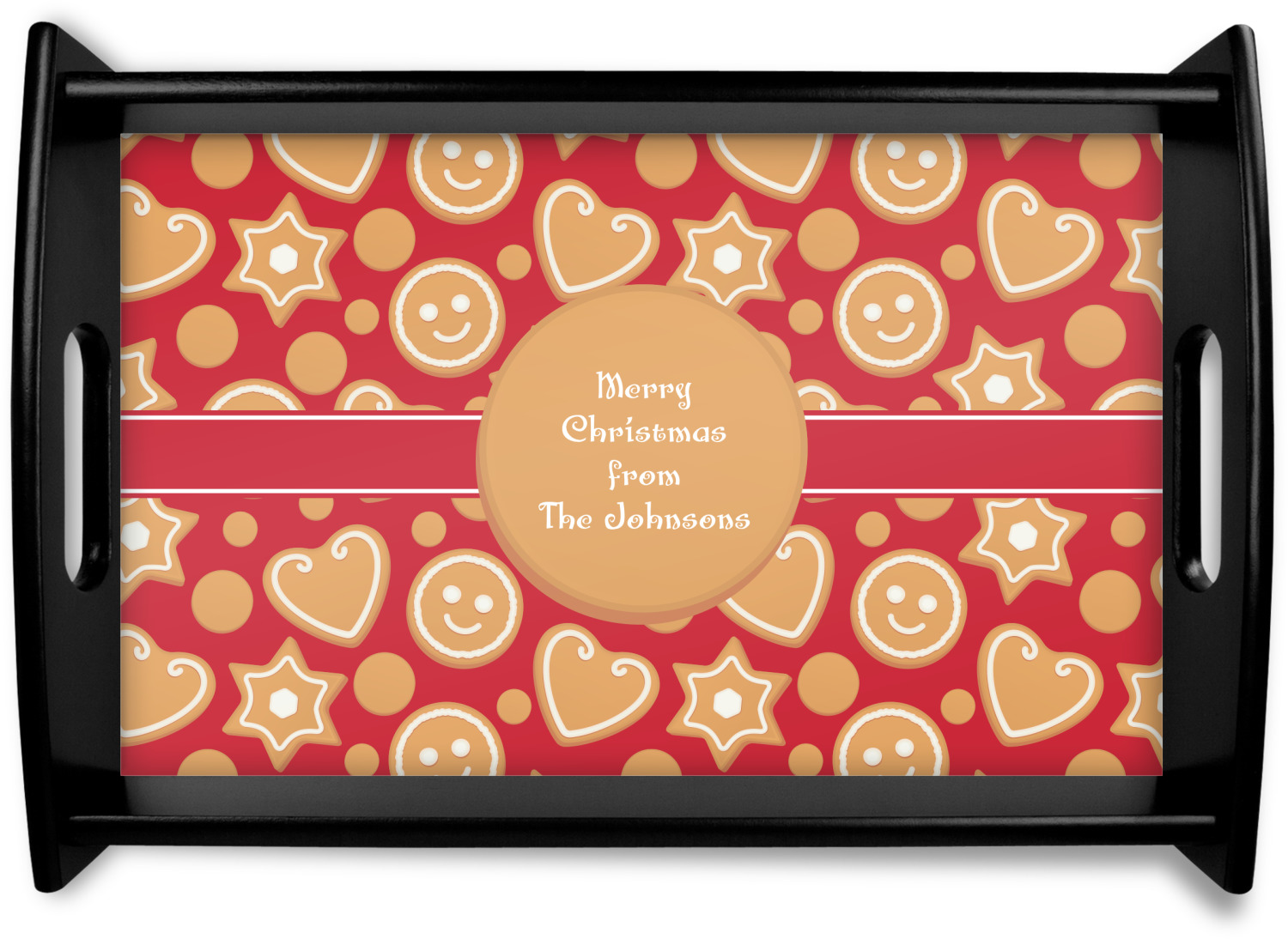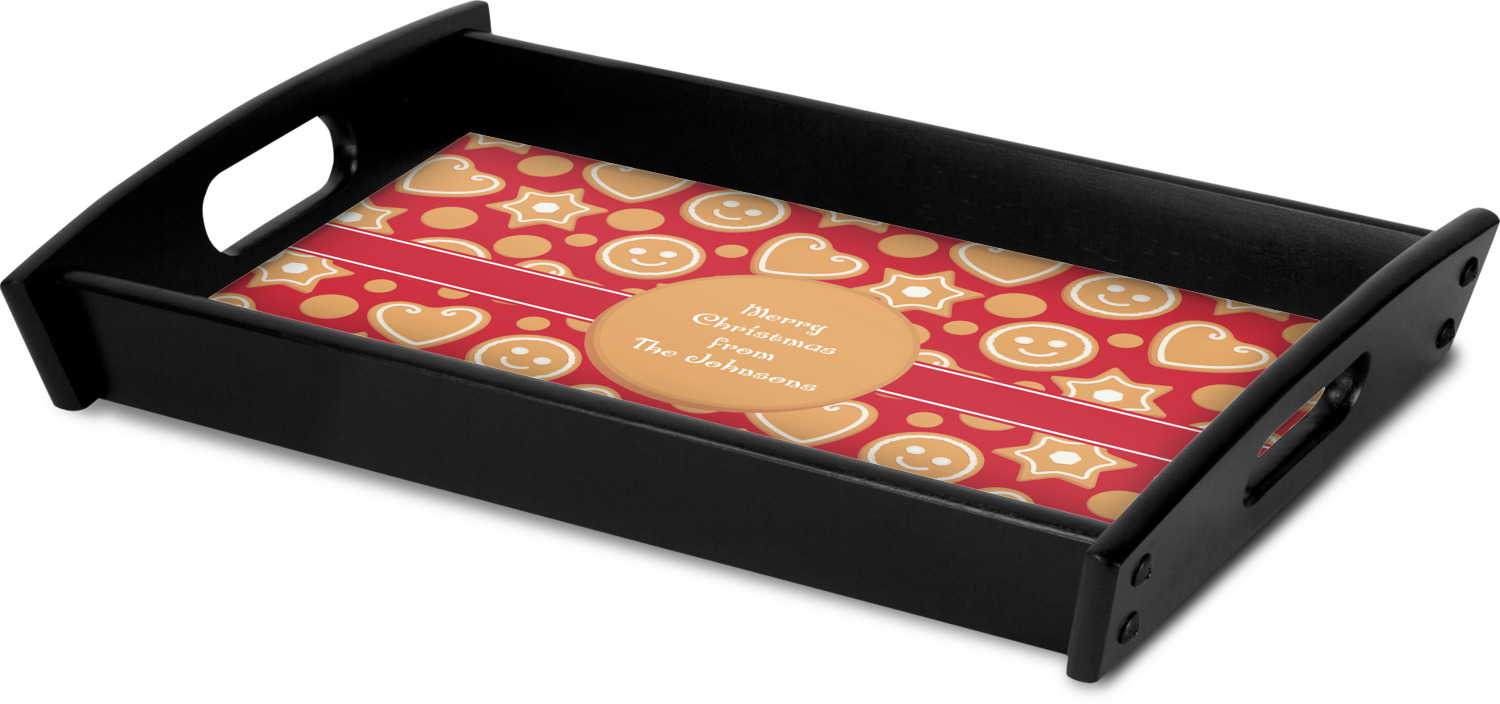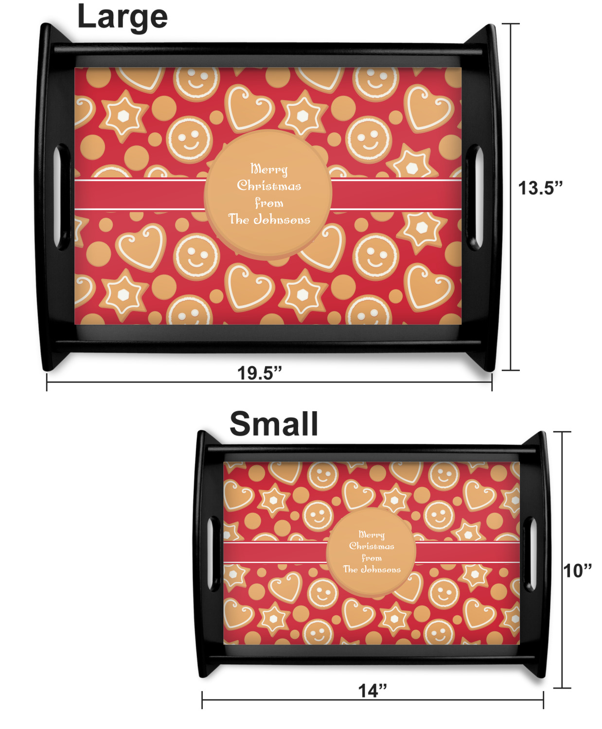 This serving tray with handles features square edges and two rounded sides, creating a very modern look. Each side is fabricated from a beautifully cut, natural wood. The bottom of the interior of the tray displays your customized design in bright, vibrant color. The tray is sold in both a black color and a natural wood look. Each variation of the wood serving tray has two sizes: Small, which is 14" x 10" x 2.25", and Large, which is 19.5" x 13.5" x 2.75".