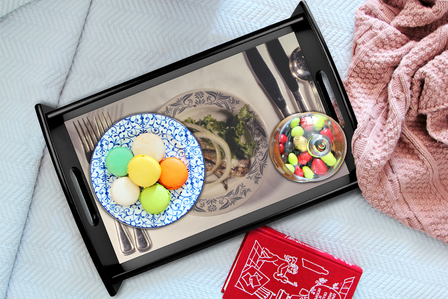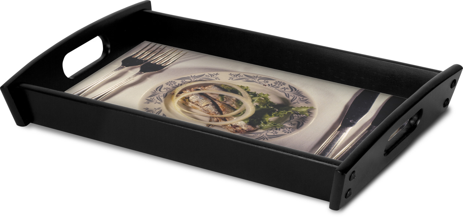 This serving tray with handles features square edges and two rounded sides, creating a very modern look. Each side is fabricated from a beautifully cut, natural wood. The bottom of the interior of the tray displays your customized design in bright, vibrant color. The tray is sold in both a black color and a natural wood look. Each variation of the wood serving tray has two sizes: Small, which is 14" x 10" x 2.25", and Large, which is 19.5" x 13.5" x 2.75".