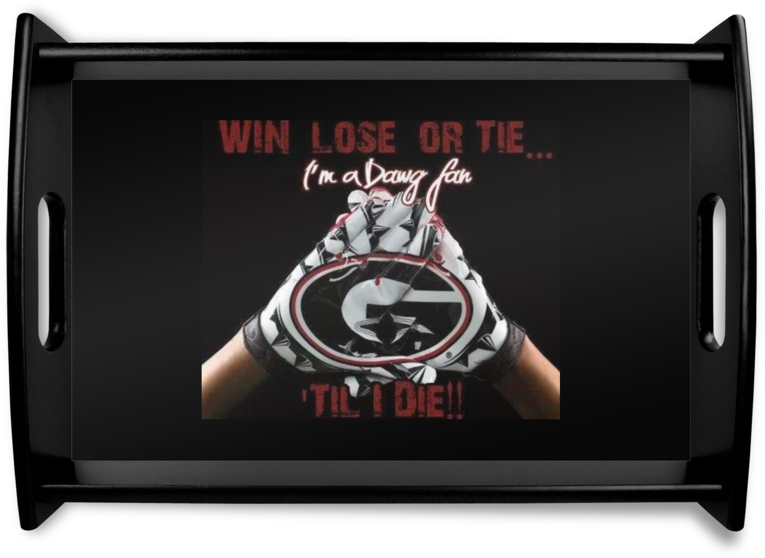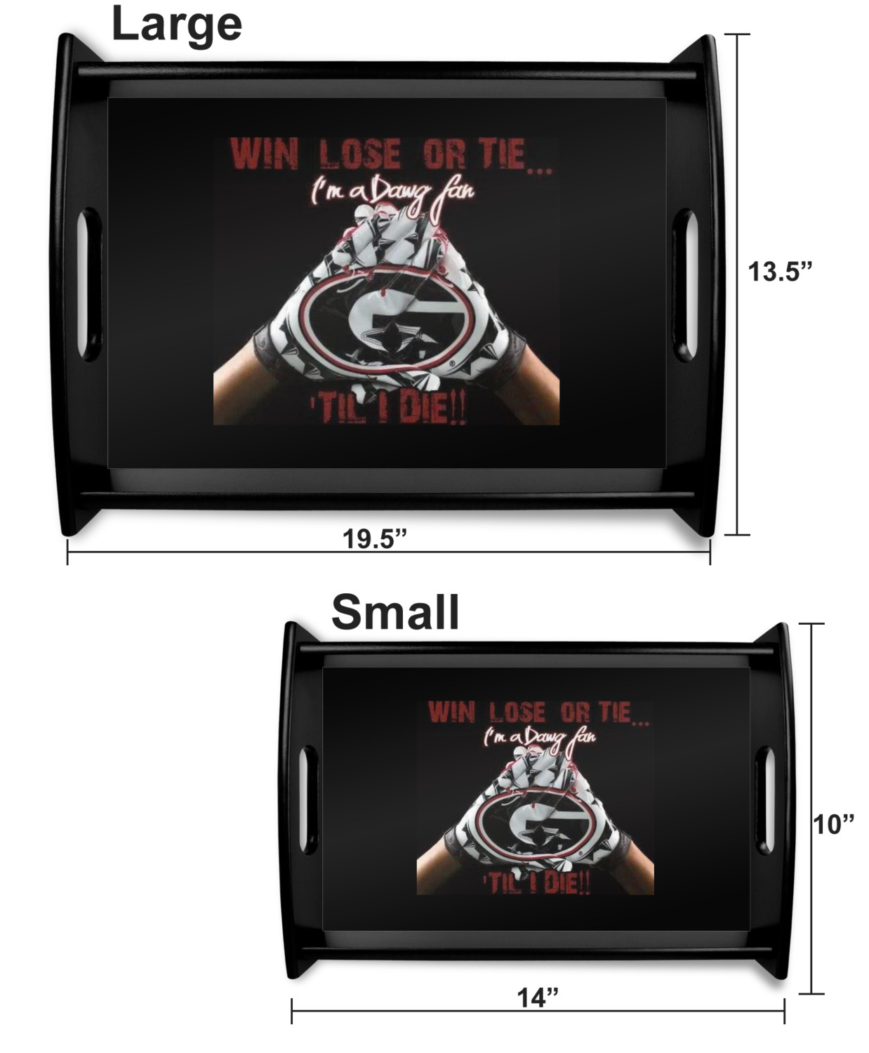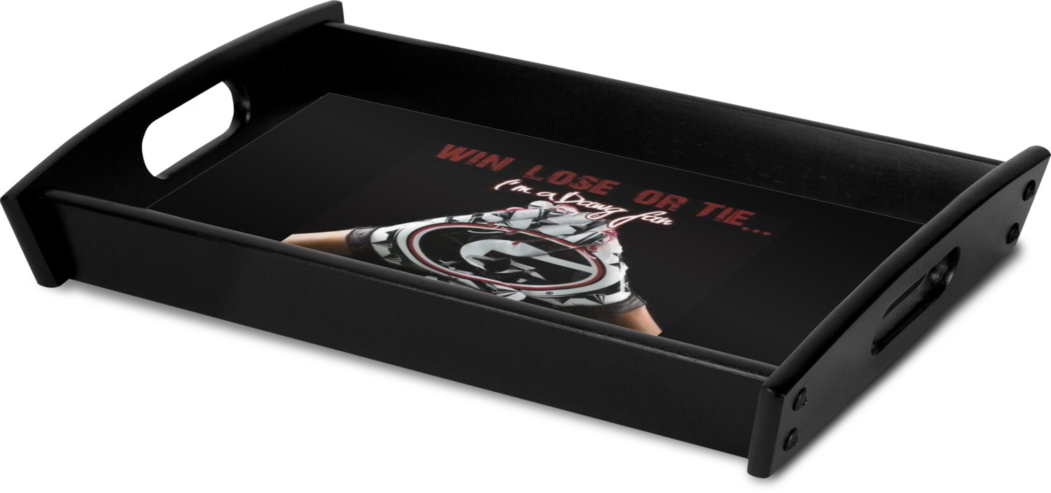 This serving tray with handles features square edges and two rounded sides, creating a very modern look. Each side is fabricated from a beautifully cut, natural wood. The bottom of the interior of the tray displays your customized design in bright, vibrant color. The tray is sold in both a black color and a natural wood look. Each variation of the wood serving tray has two sizes: Small, which is 14" x 10" x 2.25", and Large, which is 19.5" x 13.5" x 2.75".