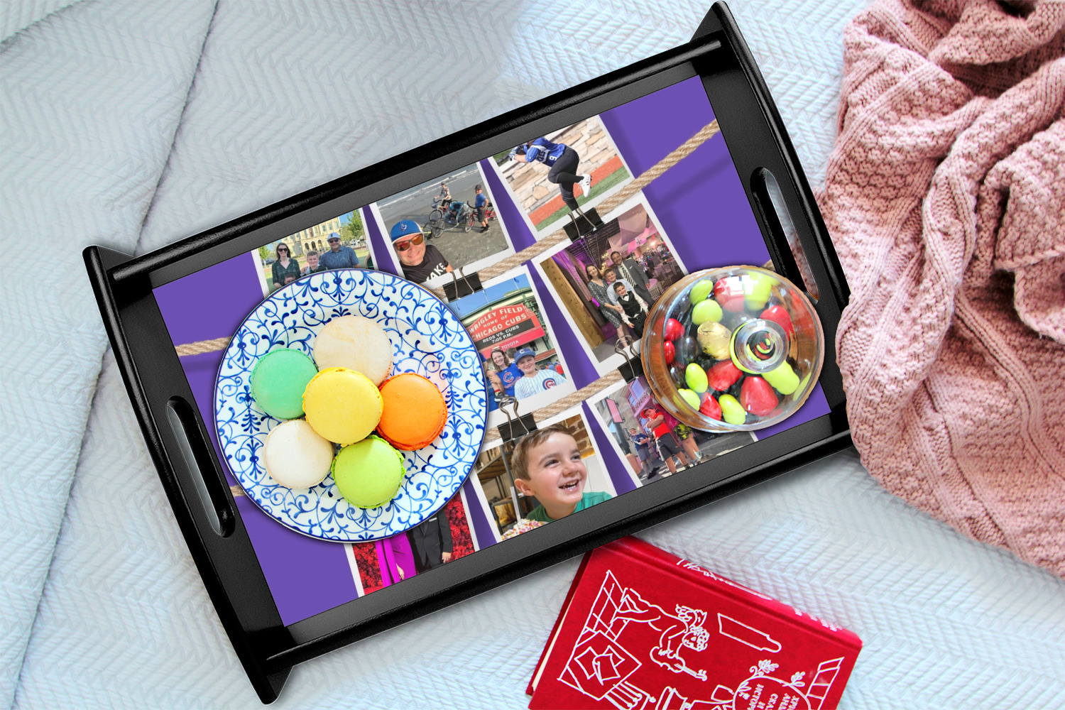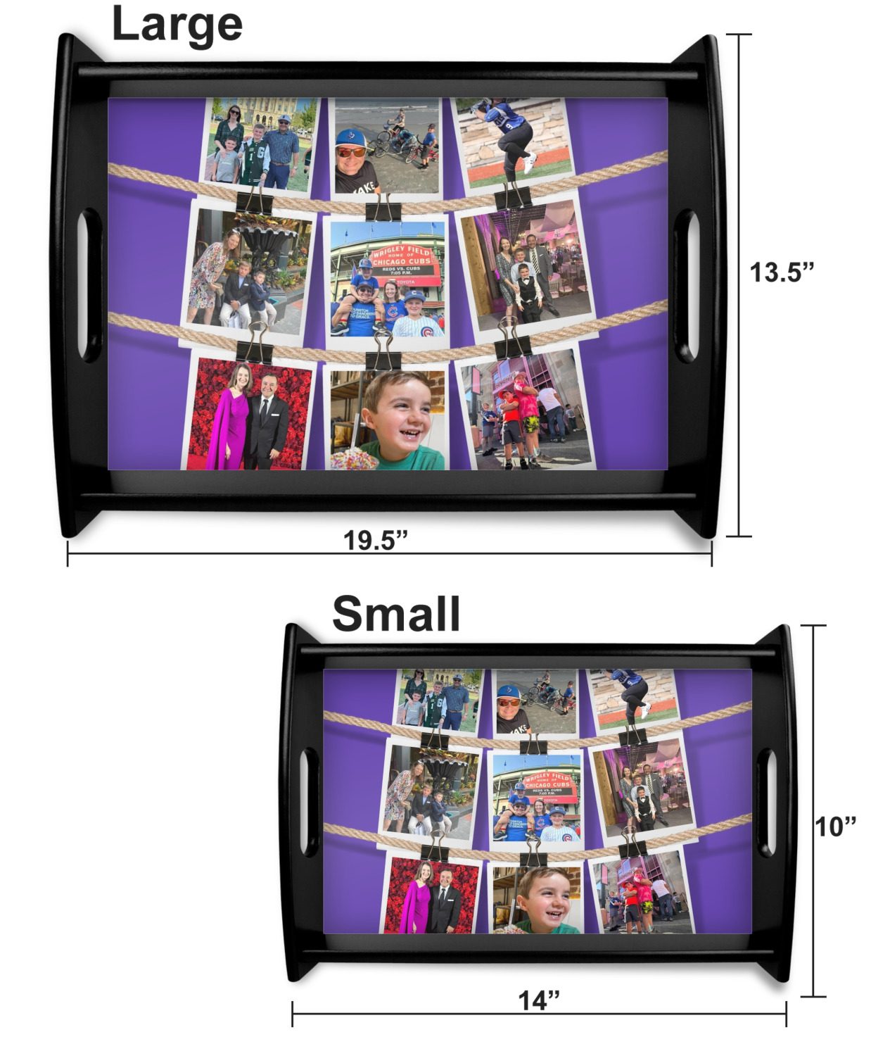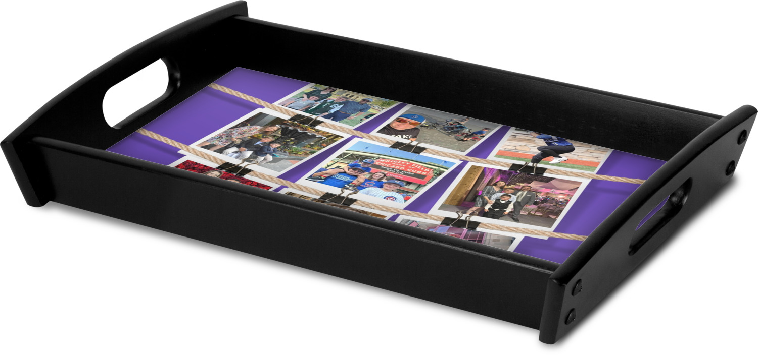 This serving tray with handles features square edges and two rounded sides, creating a very modern look. Each side is fabricated from a beautifully cut, natural wood. The bottom of the interior of the tray displays your customized design in bright, vibrant color. The tray is sold in both a black color and a natural wood look. Each variation of the wood serving tray has two sizes: Small, which is 14" x 10" x 2.25", and Large, which is 19.5" x 13.5" x 2.75".
