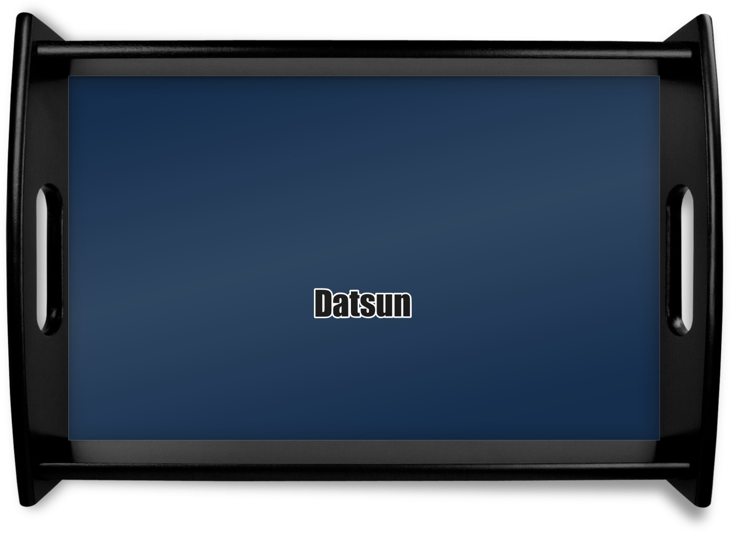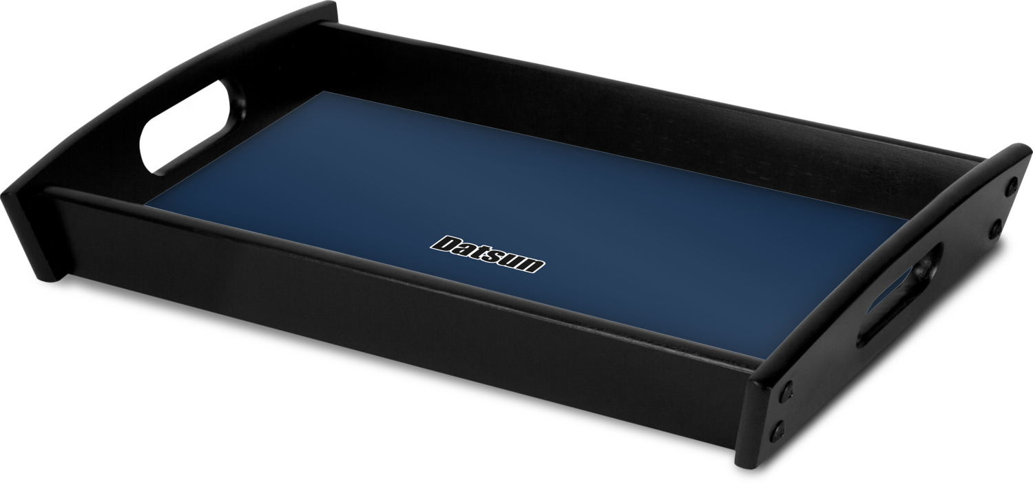 This serving tray with handles features square edges and two rounded sides, creating a very modern look. Each side is fabricated from a beautifully cut, natural wood. The bottom of the interior of the tray displays your customized design in bright, vibrant color. The tray is sold in both a black color and a natural wood look. Each variation of the wood serving tray has two sizes: Small, which is 14" x 10" x 2.25", and Large, which is 19.5" x 13.5" x 2.75".