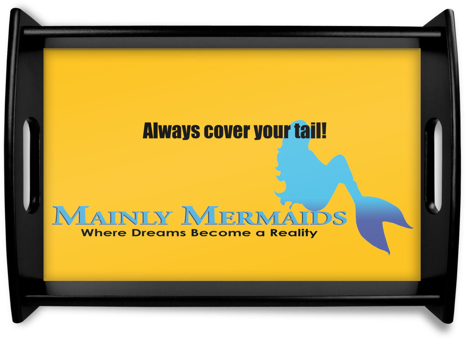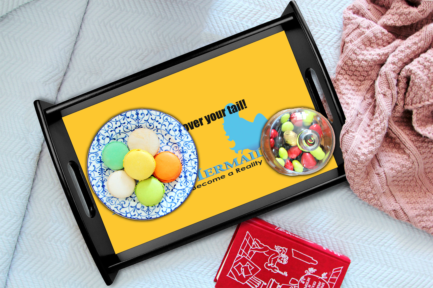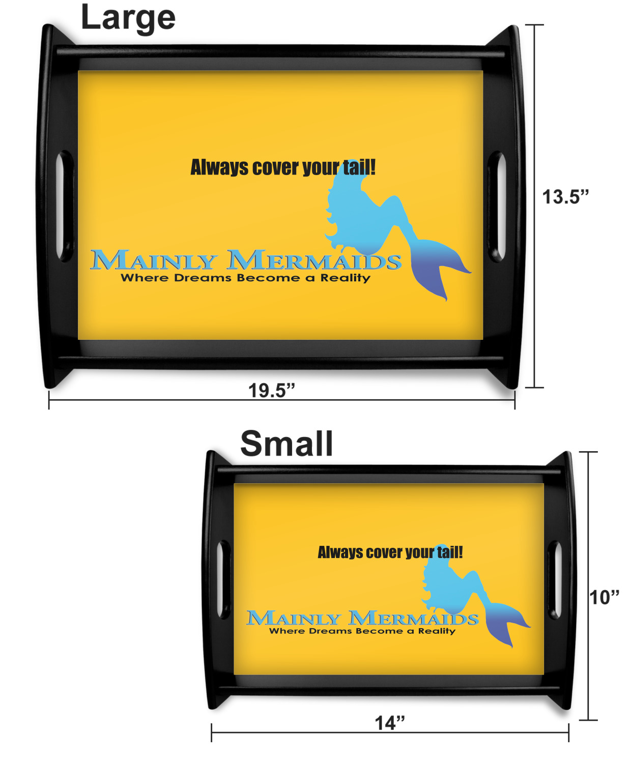 This serving tray with handles features square edges and two rounded sides, creating a very modern look. Each side is fabricated from a beautifully cut, natural wood. The bottom of the interior of the tray displays your customized design in bright, vibrant color. The tray is sold in both a black color and a natural wood look. Each variation of the wood serving tray has two sizes: Small, which is 14" x 10" x 2.25", and Large, which is 19.5" x 13.5" x 2.75".