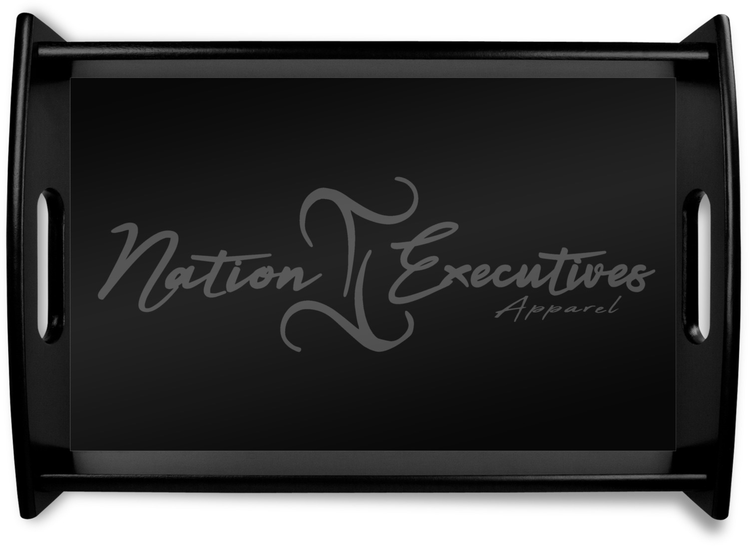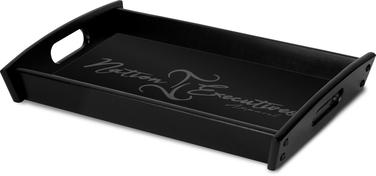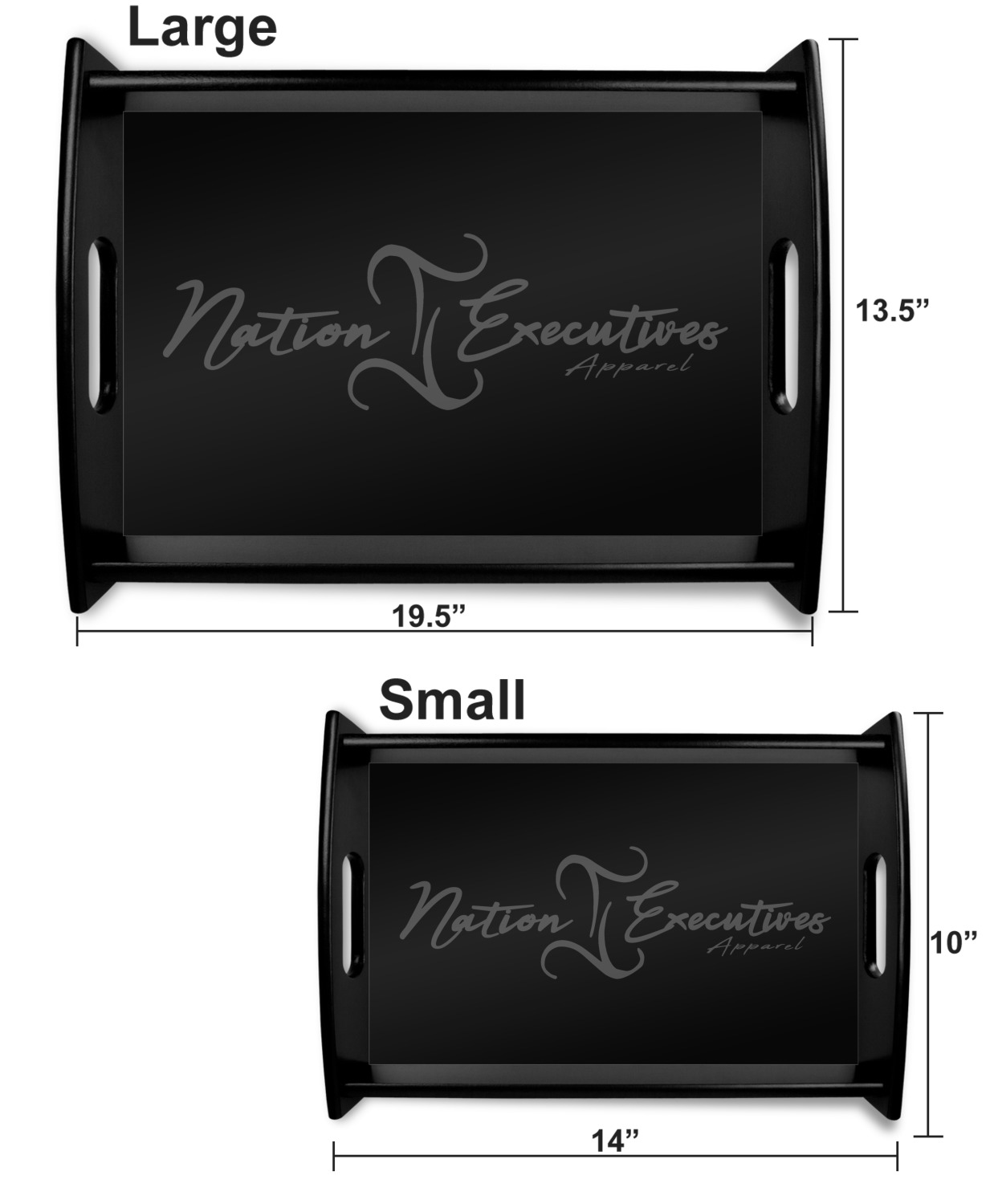 This serving tray with handles features square edges and two rounded sides, creating a very modern look. Each side is fabricated from a beautifully cut, natural wood. The bottom of the interior of the tray displays your customized design in bright, vibrant color. The tray is sold in both a black color and a natural wood look. Each variation of the wood serving tray has two sizes: Small, which is 14" x 10" x 2.25", and Large, which is 19.5" x 13.5" x 2.75".