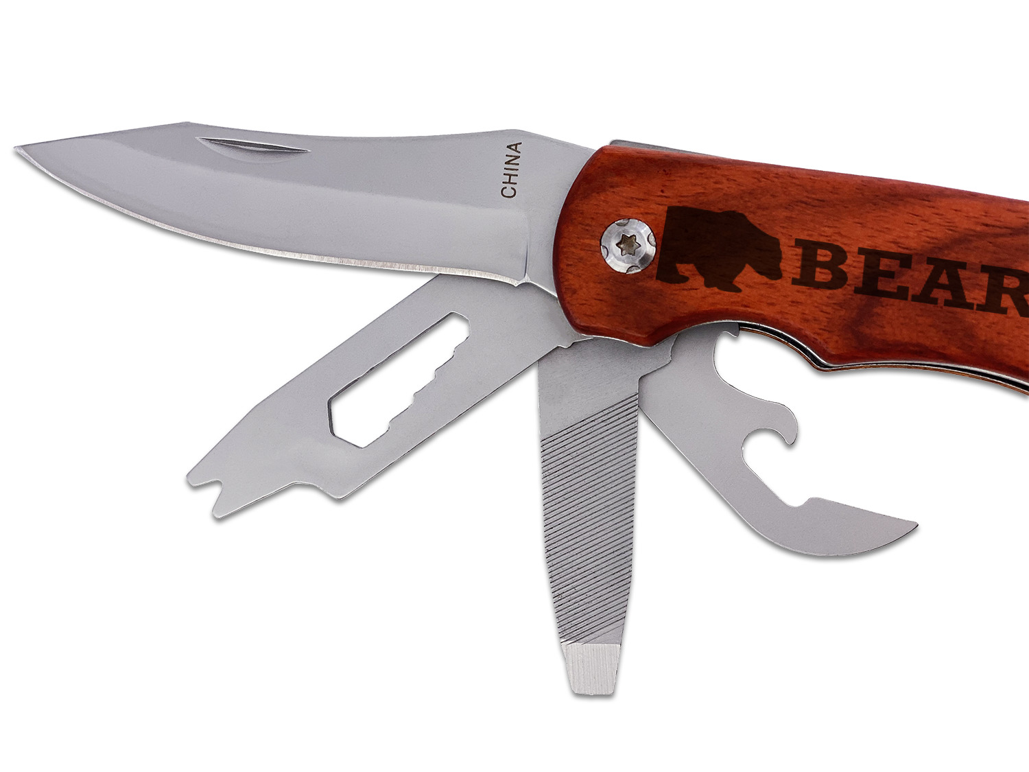 The wrench multi-tool has a knife, file, bottle and can opener, screwdriver, hex nut wrench and an adjustable wrench. The rosewood handle can be laser engraved on one or both sides to your liking to add that special personal touch for the user. Includes a black fabric pouch with belt loop for storage. Also includes white gift box.