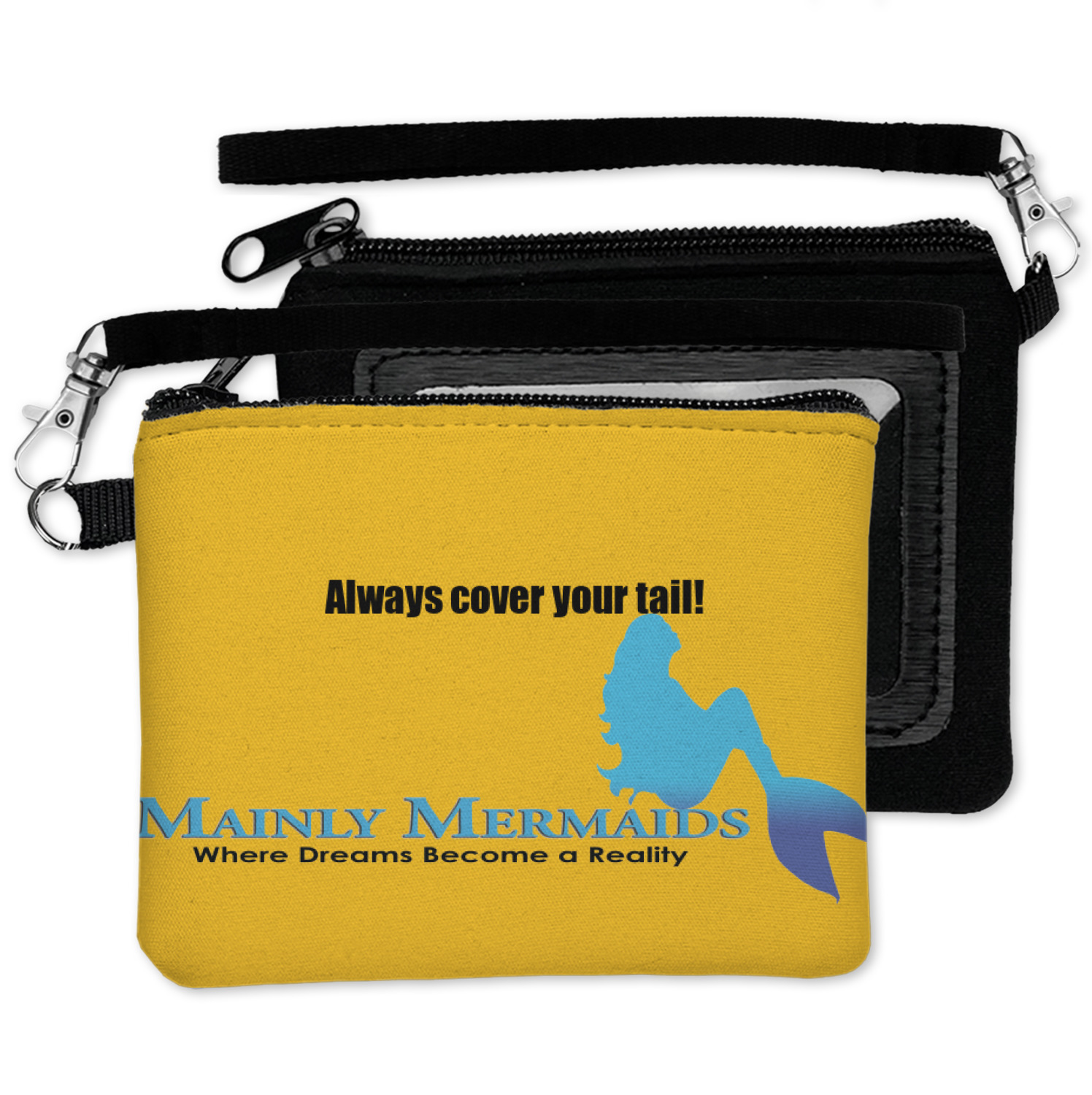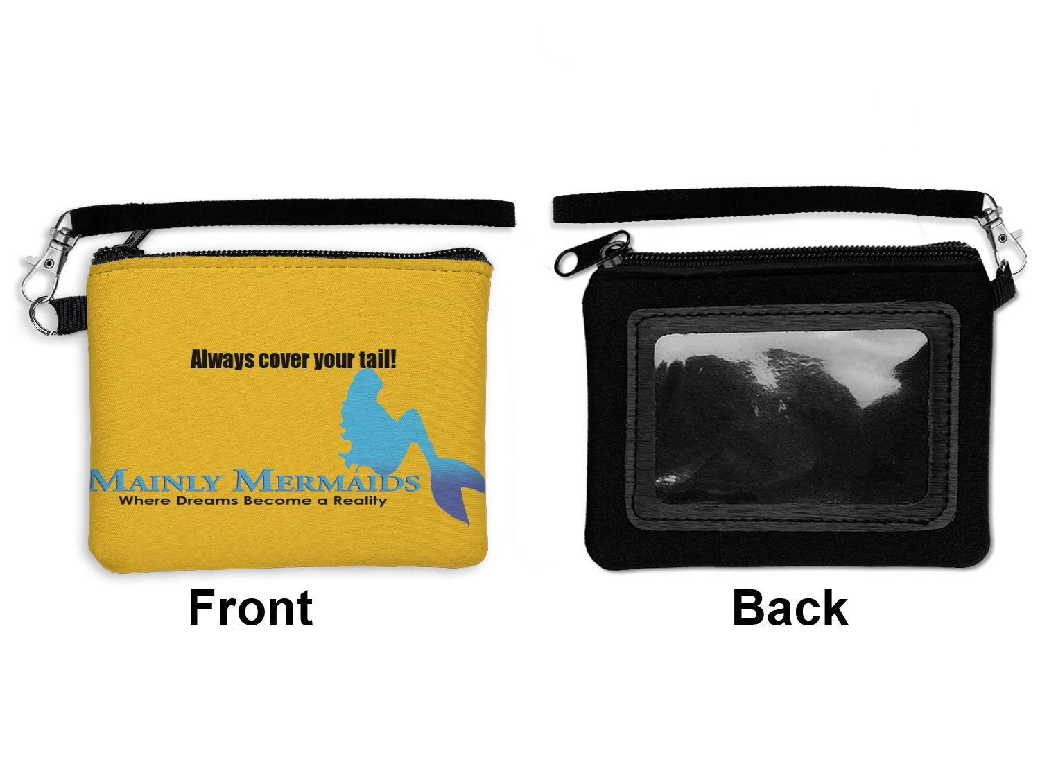 This personalized ID holder wallet comes with an ID window thats separated from the main compartment. With a zipper closure and a lobster claw clasp keychain to stay on your wrist, youll never have to worry about losing your contents or your entire wallet.