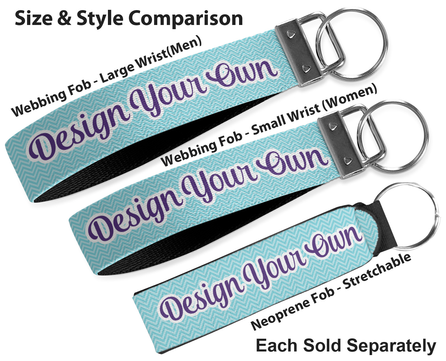 These key fob keychains are made from a polyester weave, right here in the USA. They feature a silver, metal clasp, attached to a round keyring. The piece gives the personalized wristlet a beautiful, finished look. Your customized design is printed on the outside of the keychain strap. We carry these wristlets in two sizes: small, which is 5 inches in width, and large, which is 5.5 inches in width.