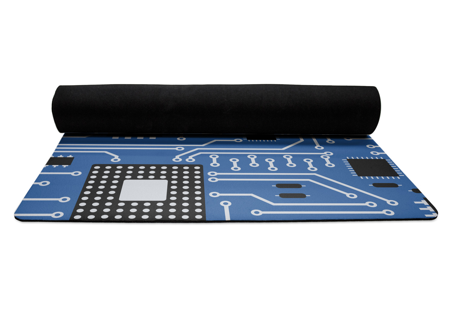 The top of the mats are dyed with your design using eco friendly non solvent inks. They have a smooth fleece felt top and feels very soft. The back of the mat is a sleek black and is a squishy non-slip texture to ensure that your mat does not slip on the floor. Our rubber backed mats are the perfect size at 68" x 24" and are just under approximately 1/4 inch thickness.