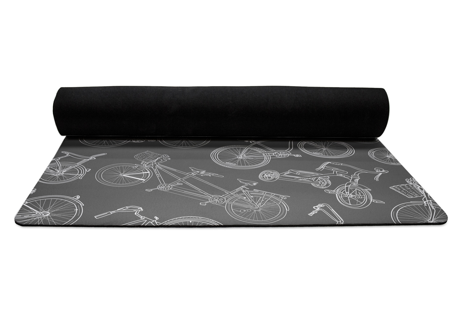 The top of the mats are dyed with your design using eco friendly non solvent inks. They have a smooth fleece felt top and feels very soft. The back of the mat is a sleek black and is a squishy non-slip texture to ensure that your mat does not slip on the floor. Our rubber backed mats are the perfect size at 68" x 24" and are just under approximately 1/4 inch thickness.