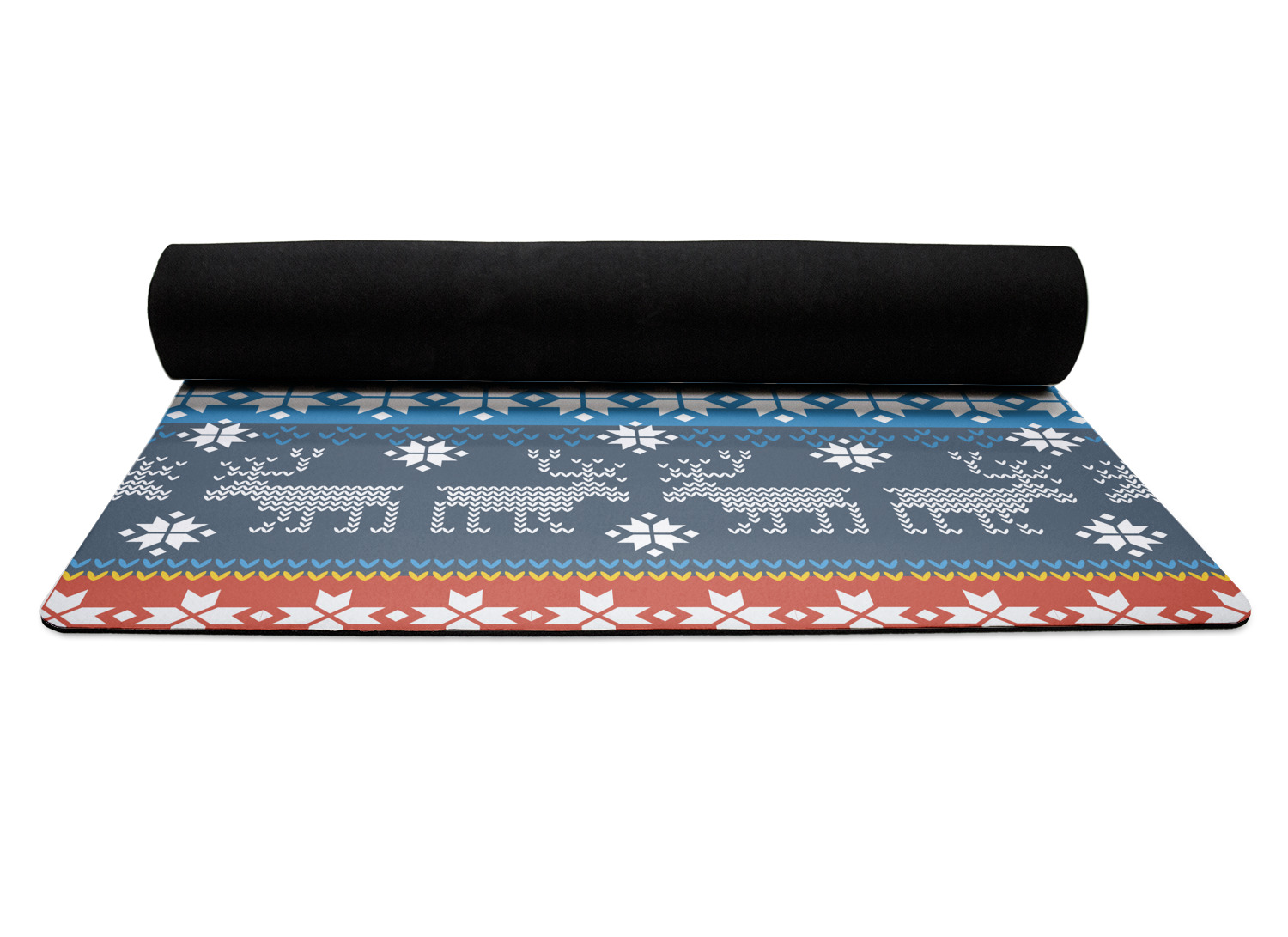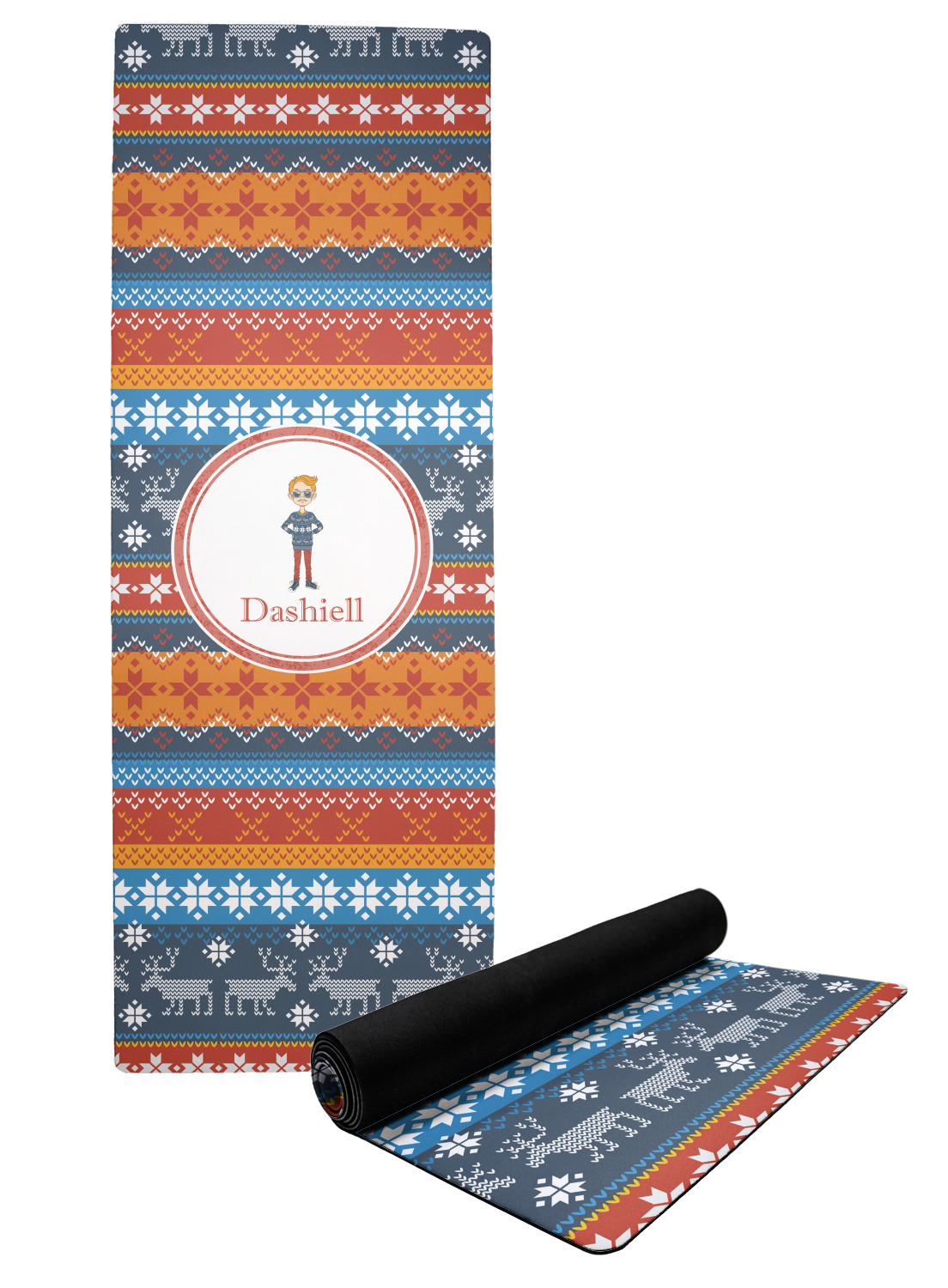 The top of the mats are dyed with your design using eco friendly non solvent inks. They have a smooth fleece felt top and feels very soft. The back of the mat is a sleek black and is a squishy non-slip texture to ensure that your mat does not slip on the floor. Our rubber backed mats are the perfect size at 68" x 24" and are just under approximately 1/4 inch thickness.