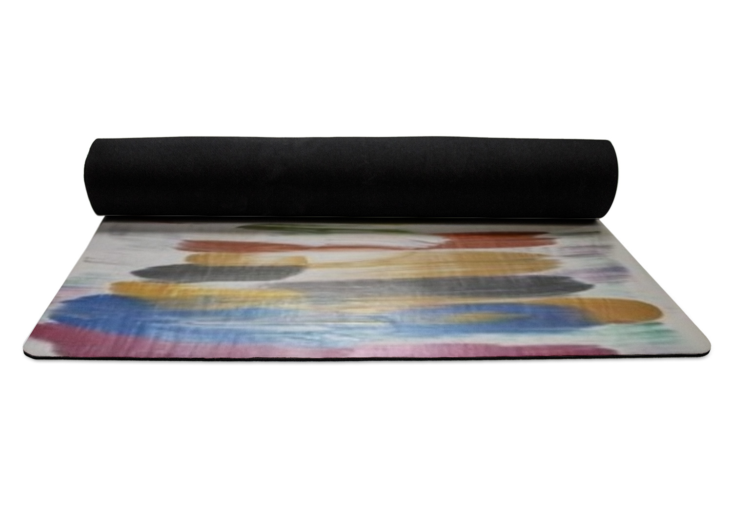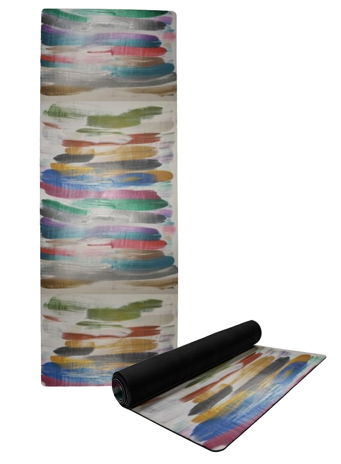 The top of the mats are dyed with your design using eco friendly non solvent inks. They have a smooth fleece felt top and feels very soft. The back of the mat is a sleek black and is a squishy non-slip texture to ensure that your mat does not slip on the floor. Our rubber backed mats are the perfect size at 68" x 24" and are just under approximately 1/4 inch thickness.