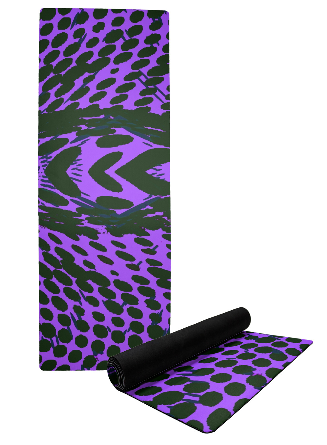 The top of the mats are dyed with your design using eco friendly non solvent inks. They have a smooth fleece felt top and feels very soft. The back of the mat is a sleek black and is a squishy non-slip texture to ensure that your mat does not slip on the floor. Our rubber backed mats are the perfect size at 68" x 24" and are just under approximately 1/4 inch thickness.