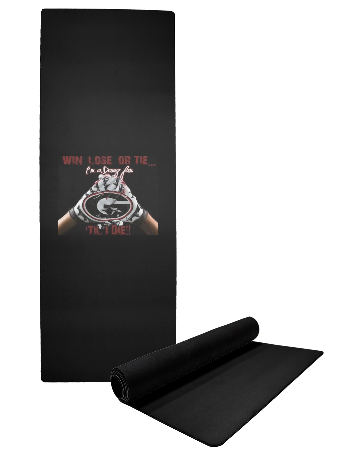 The top of the mats are dyed with your design using eco friendly non solvent inks. They have a smooth fleece felt top and feels very soft. The back of the mat is a sleek black and is a squishy non-slip texture to ensure that your mat does not slip on the floor. Our rubber backed mats are the perfect size at 68" x 24" and are just under approximately 1/4 inch thickness.