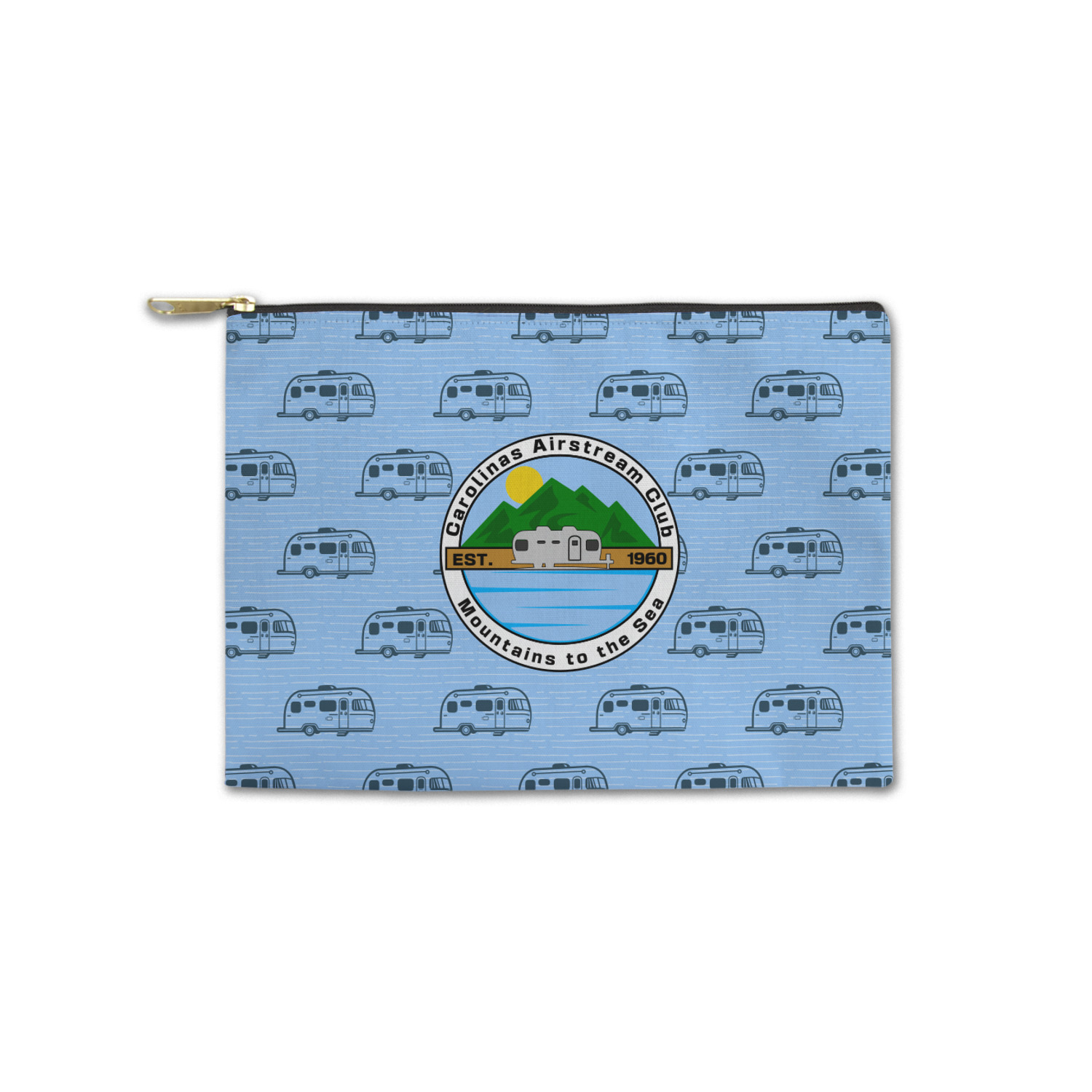 Our zippered pouches are available in two sizes - small: approx 8.5W"x6H and large: approx 12.5Wx8.5H. The pouches are made from a soft & durable canvas fabric that is printed on the outside with your design; the inside has a fused black lining. The printed canvas fabric is then cut and the pouches are sewn right here in the USA. The zipper itself is gold in color and has a round hook.