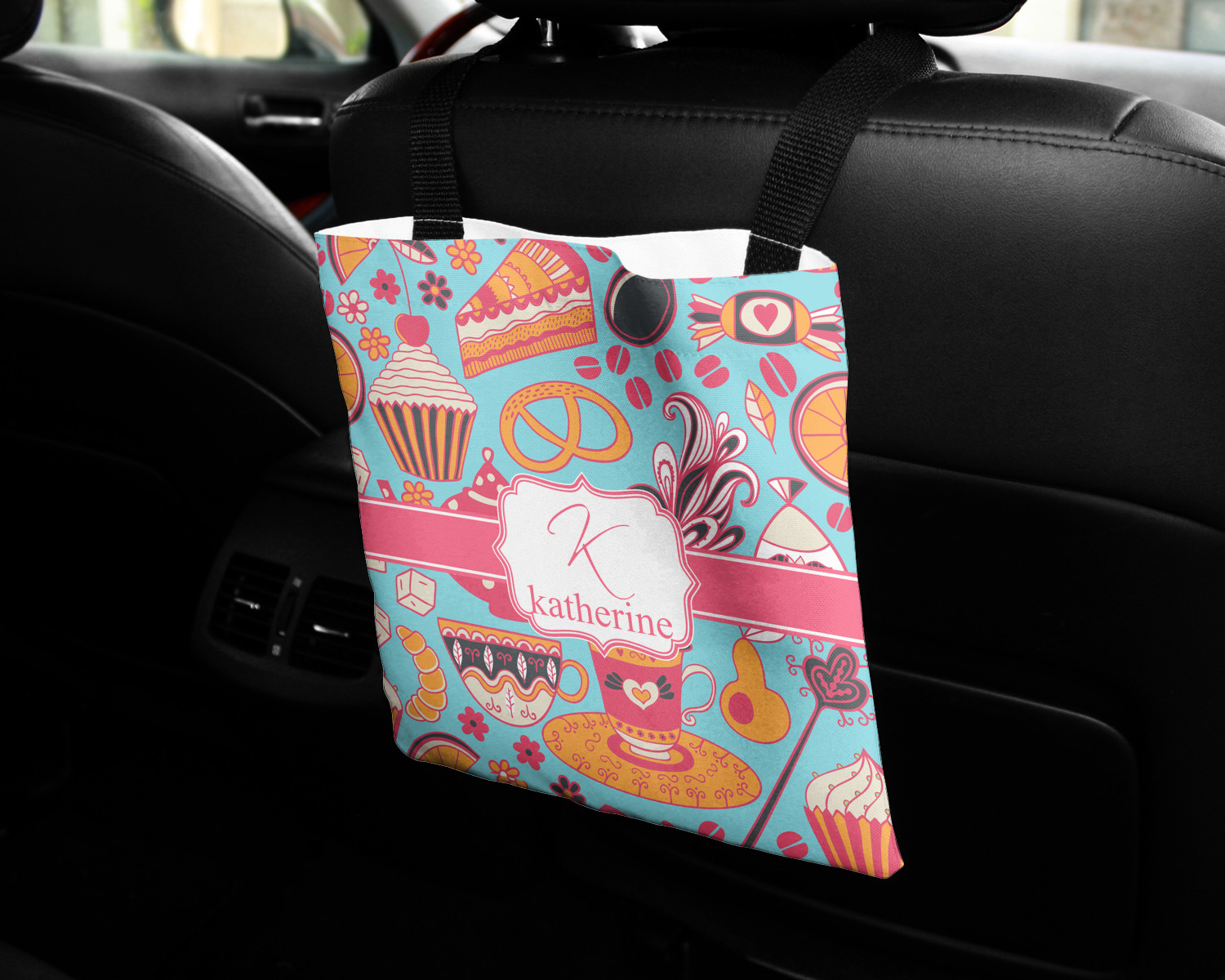 These car back seat organizers are sturdy tote-like bags, fabricated from a robust polyester, and features a single handle on the back side. The strap features an attachable velcro for easy attachment to headrests, grocery carts, car seats, and more. Simply undo the velcro, loop the strap around the headrest, reattach the velcro, and let the organizer hang from the front seat. These car organizers are the perfect means of increasing your backseat's legroom, while storing multiple items in one place for better accessibility. Each car back seat organizer measures at 10 by 10 inches, and features your personalized design printed across its front and back.