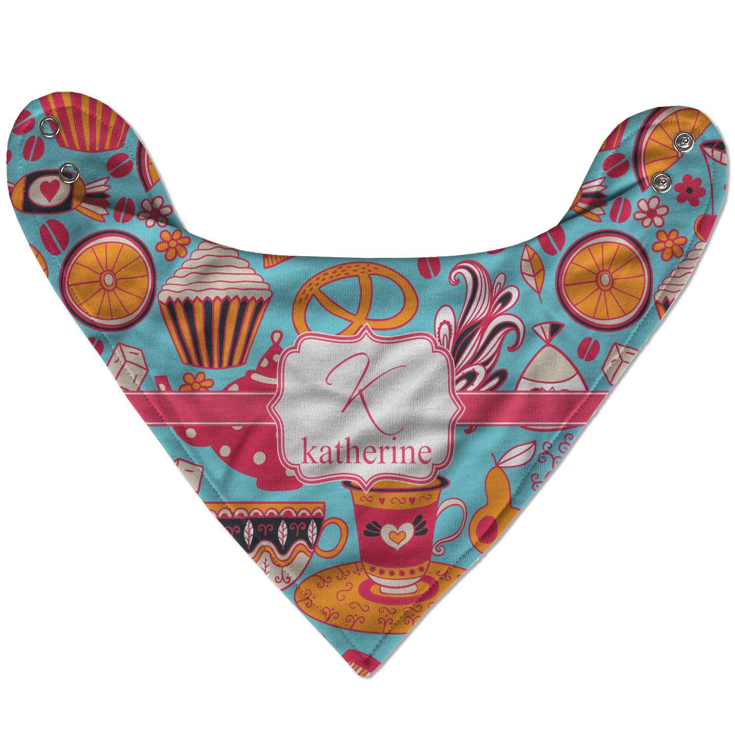 Every woman knows, brunch is vital to happiness. And what's brunch without coffee and cupcakes and fruit? This upbeat design features all these beloved ingredients in bright oranges and pinks, set on a teal background.