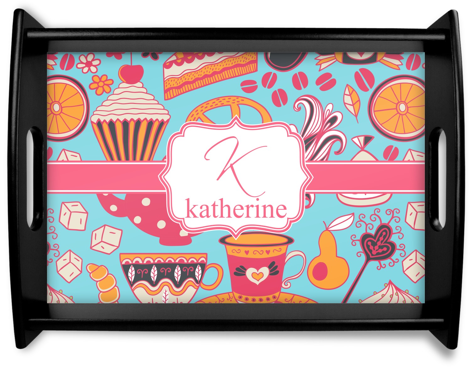 Every woman knows, brunch is vital to happiness. And what's brunch without coffee and cupcakes and fruit? This upbeat design features all these beloved ingredients in bright oranges and pinks, set on a teal background.