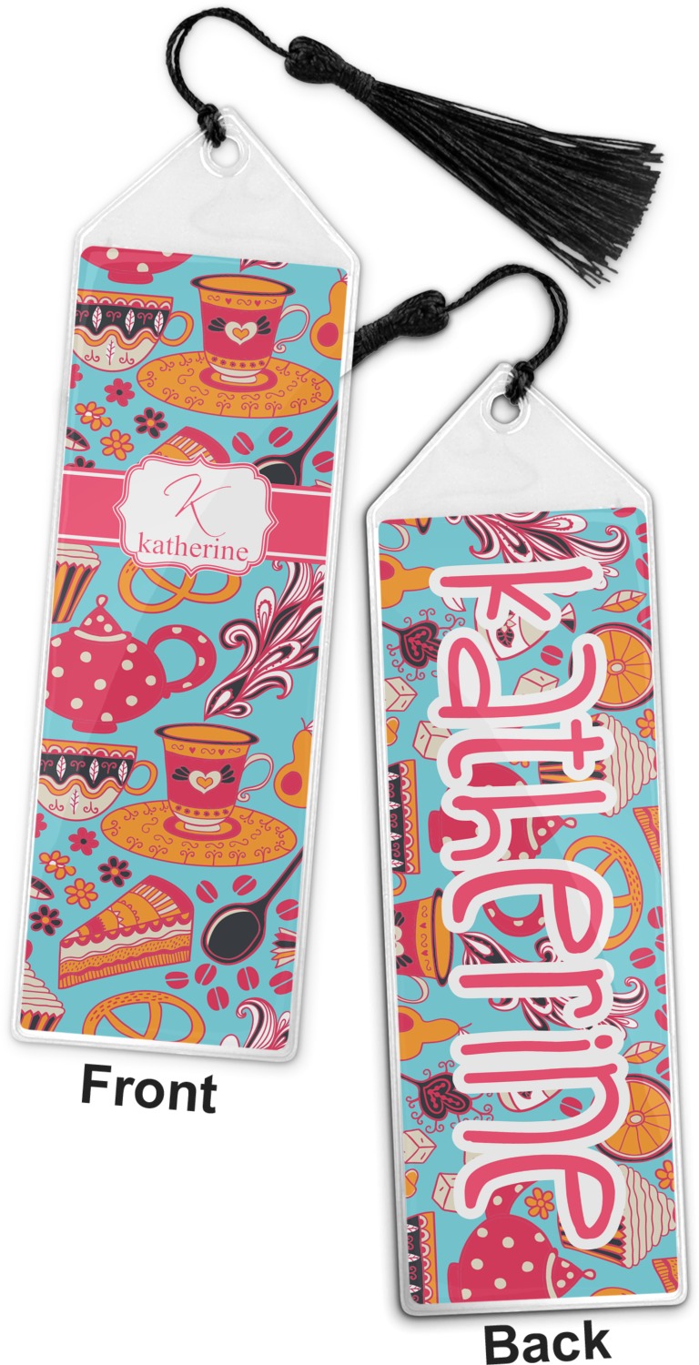 Your personalized bookmark is made of a sturdy, clear vinyl, and is approximately 7.5" x 2.25". We display your personalization on vinyl inserts that are placed on both sides. Accompanying each book marker is a black, fringe tassel that attaches to the reinforced, triangular header.