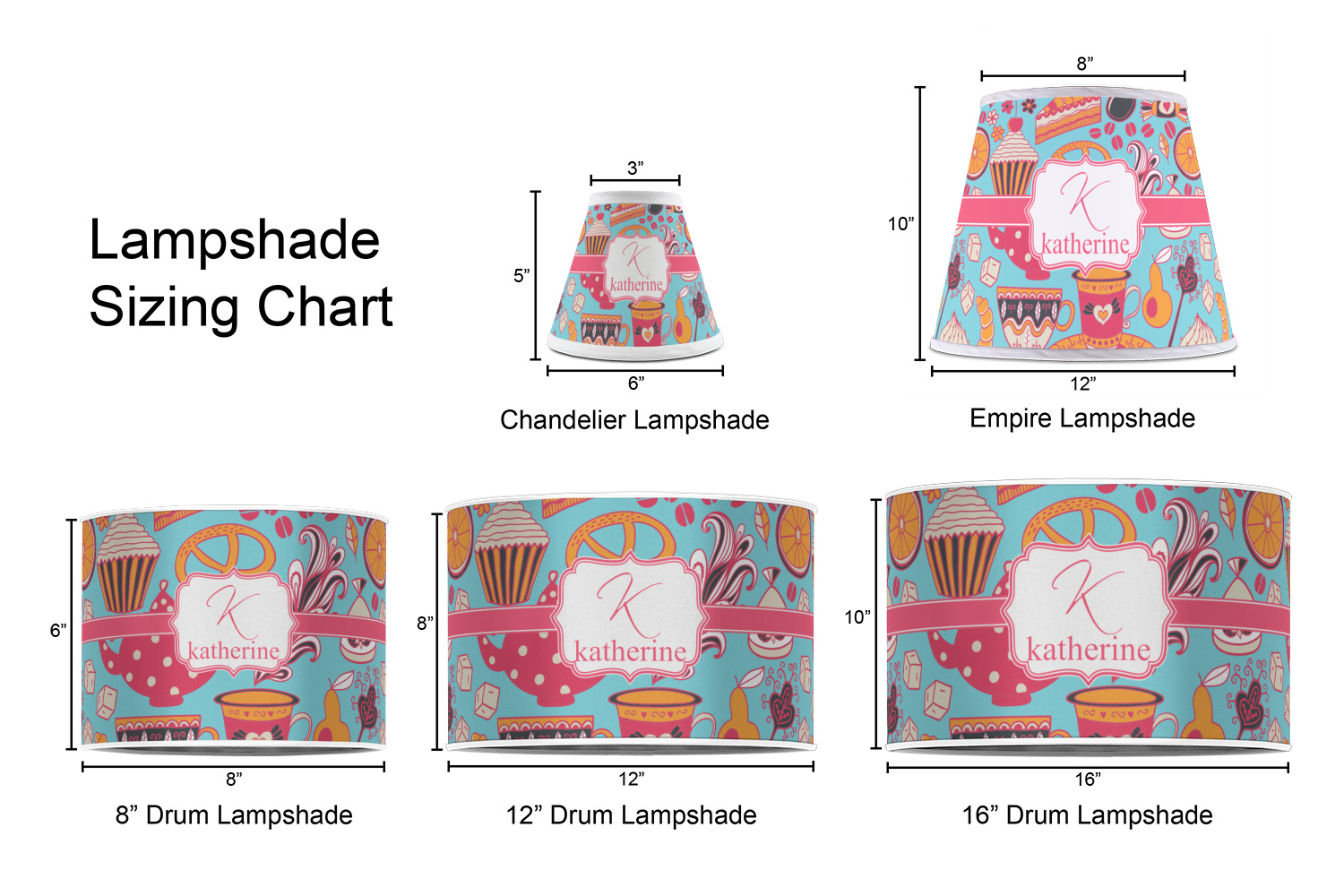 Our customized lamp shades also come in 3 different sizes: 8", 12" and 16", measuring at 8" in diameter by 6" tall, 12" in diameter by 8" tall, and 16" in diameter by 10" tall, respectively.