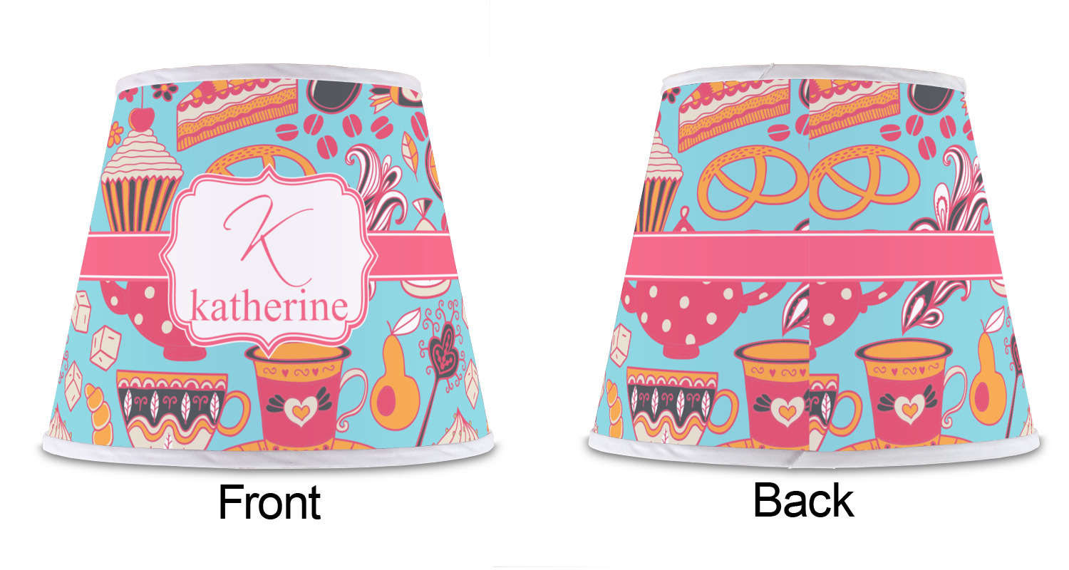 The base of this lampshade is 12 inches in diameter, and the top spans 8 inches in diameter. The total height of the lampshade is 10 inches. The angled nature of this custom lampshade concentrates the light, making it ideal for smaller spaces. This lampshade is made of matte, polyfilm, and displays your customization in its middle. The top and bottom of this colorful lamp shade are lined with a white fabric ribbon (which can be replaced with black inside the design studio) which frames your design and creates a sophisticated finish. As an UNO fitter lampshade, this unique lamp shade will fit a variety of bases.
