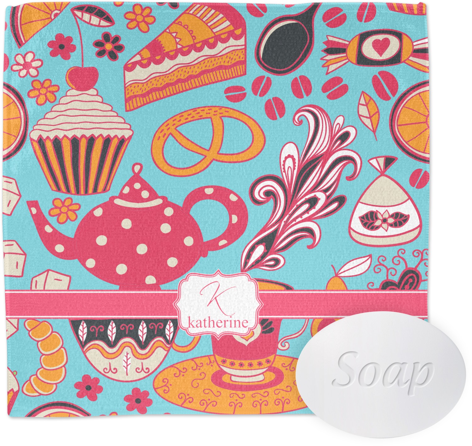 Every woman knows, brunch is vital to happiness. And what's brunch without coffee and cupcakes and fruit? This upbeat design features all these beloved ingredients in bright oranges and pinks, set on a teal background.