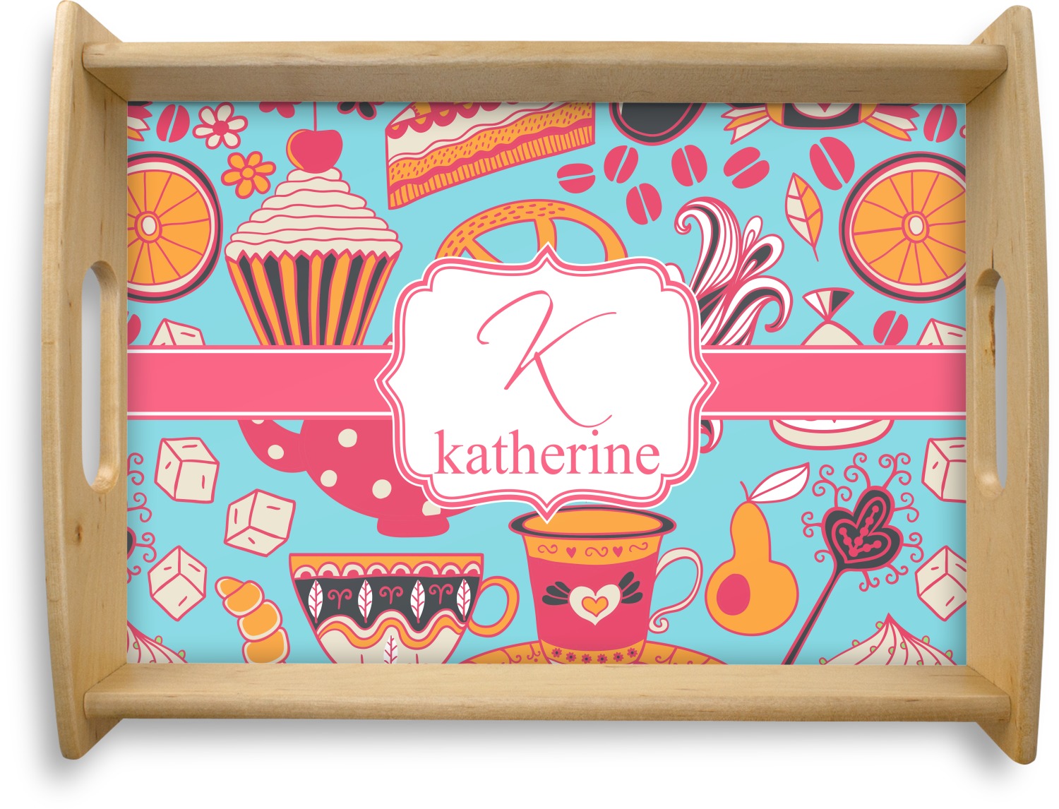 Every woman knows, brunch is vital to happiness. And what's brunch without coffee and cupcakes and fruit? This upbeat design features all these beloved ingredients in bright oranges and pinks, set on a teal background.