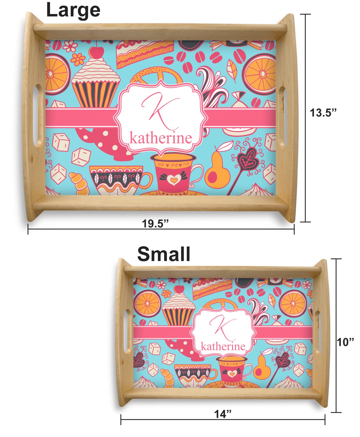 This serving tray with handles features square edges and two rounded sides, creating a very modern look. Each side is fabricated from a beautifully cut, natural wood. The bottom of the interior of the tray displays your customized design in bright, vibrant color. The tray is sold in both a black color and a natural wood look. Each variation of the wood serving tray has two sizes: Small, which is 14" x 10" x 2.25", and Large, which is 19.5" x 13.5" x 2.75".