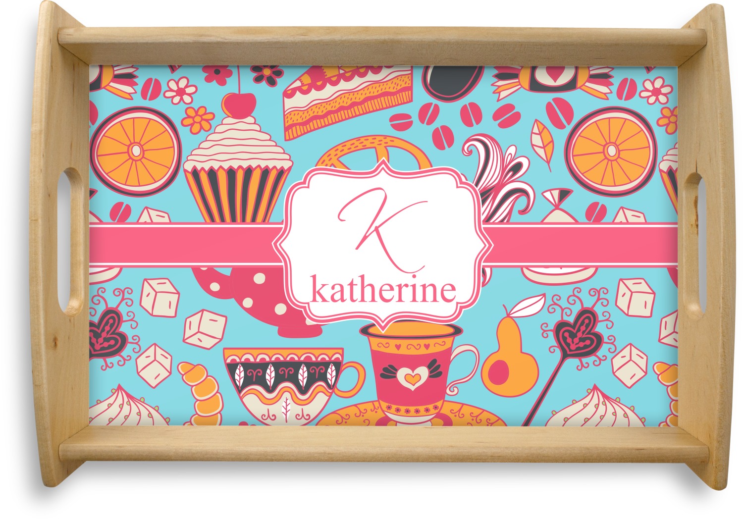 This serving tray with handles features square edges and two rounded sides, creating a very modern look. Each side is fabricated from a beautifully cut, natural wood. The bottom of the interior of the tray displays your customized design in bright, vibrant color. The tray is sold in both a black color and a natural wood look. Each variation of the wood serving tray has two sizes: Small, which is 14" x 10" x 2.25", and Large, which is 19.5" x 13.5" x 2.75".