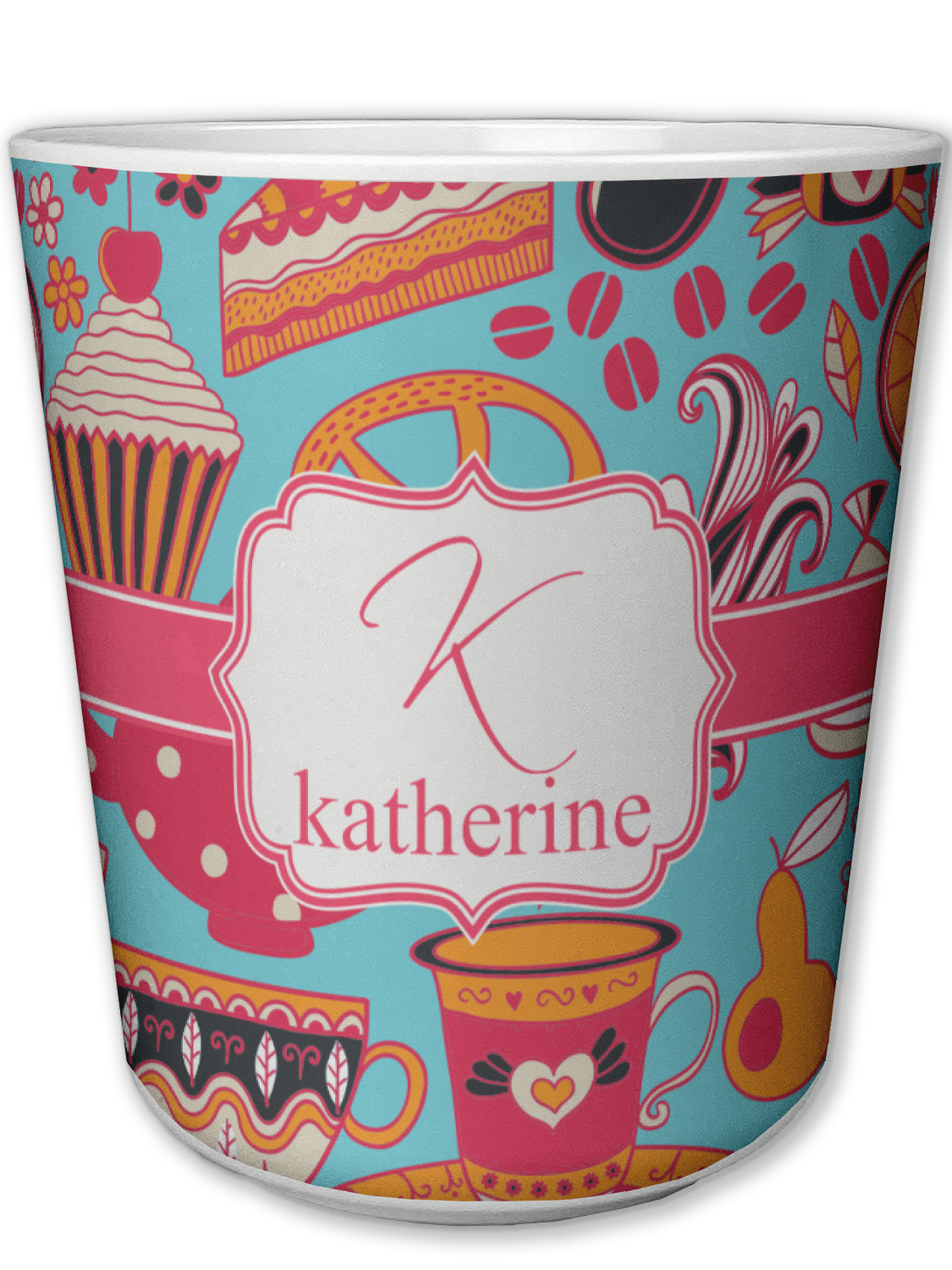 Every woman knows, brunch is vital to happiness. And what's brunch without coffee and cupcakes and fruit? This upbeat design features all these beloved ingredients in bright oranges and pinks, set on a teal background.