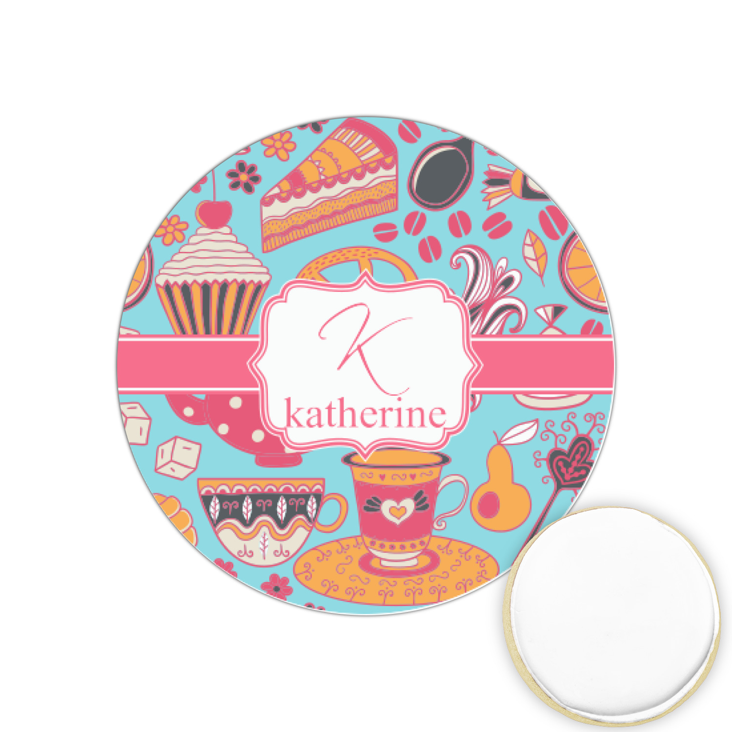 Every woman knows, brunch is vital to happiness. And what's brunch without coffee and cupcakes and fruit? This upbeat design features all these beloved ingredients in bright oranges and pinks, set on a teal background.