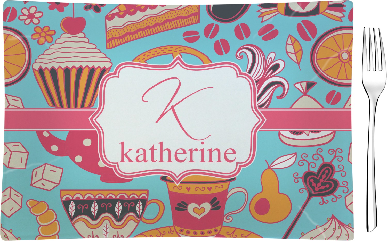 Every woman knows, brunch is vital to happiness. And what's brunch without coffee and cupcakes and fruit? This upbeat design features all these beloved ingredients in bright oranges and pinks, set on a teal background.