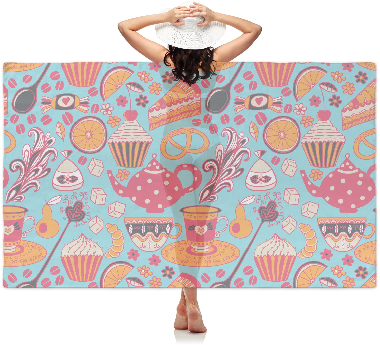 Every woman knows, brunch is vital to happiness. And what's brunch without coffee and cupcakes and fruit? This upbeat design features all these beloved ingredients in bright oranges and pinks, set on a teal background.